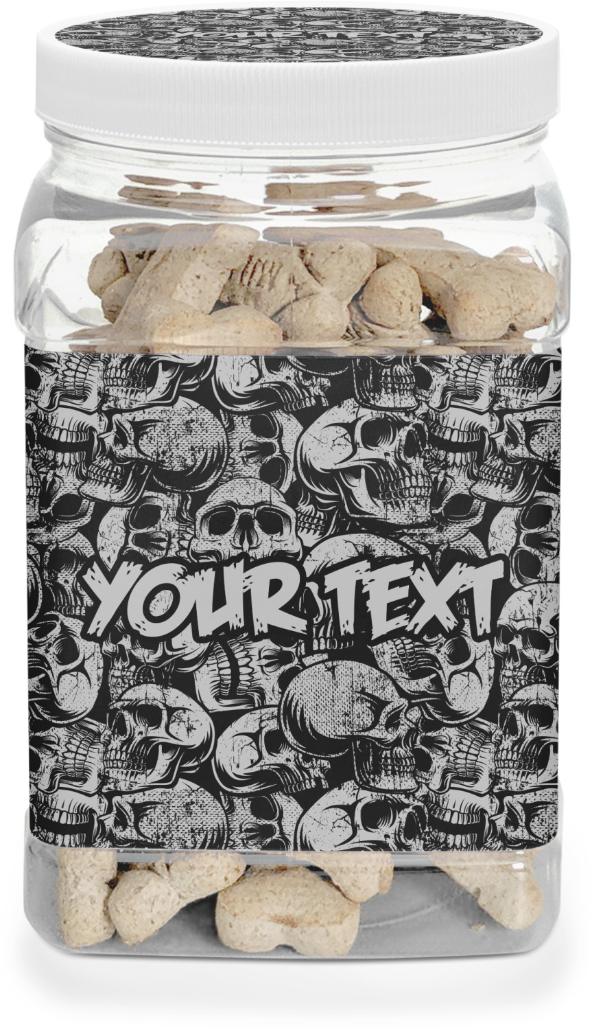 This half gallon jar, made from a sturdy plastic, is the perfect way to keep treats from any naughty pet paws, while still keeping them ready on hand for when your pup performs an impressive trick. This dog cookie jar features a screw-on, white lid that displays your personalized design on a vinyl sticker. We apply another customized sticker that wraps around the front and sides of the jar. Our dog treat jar also has indentations on the rear ends of the sides, which allows for convenient handling, and its square frame allows for easy storage.