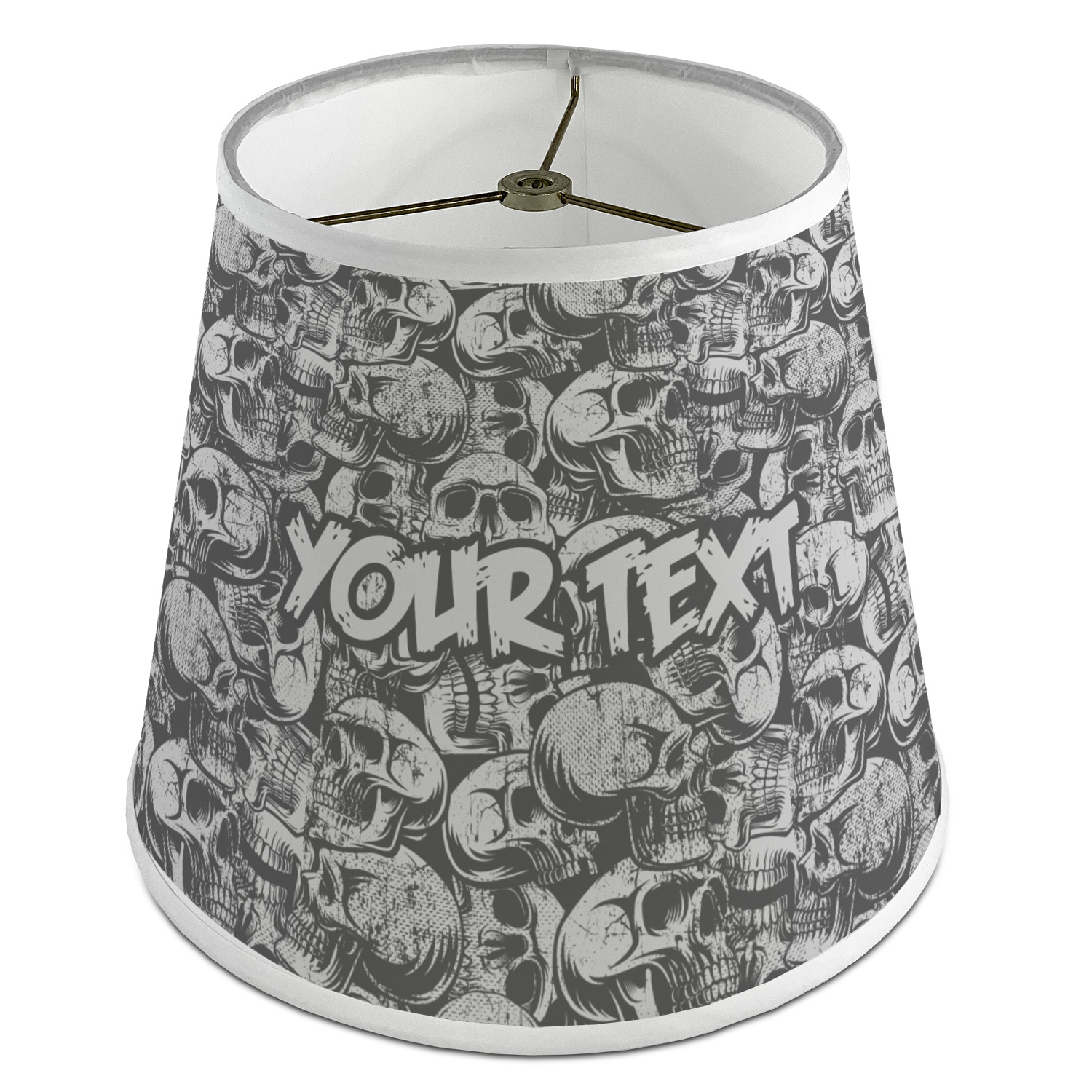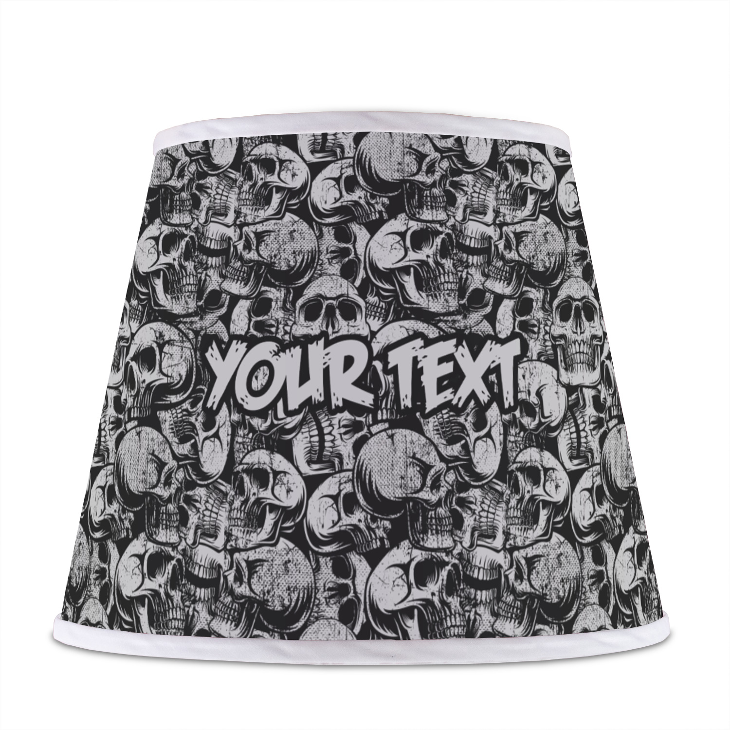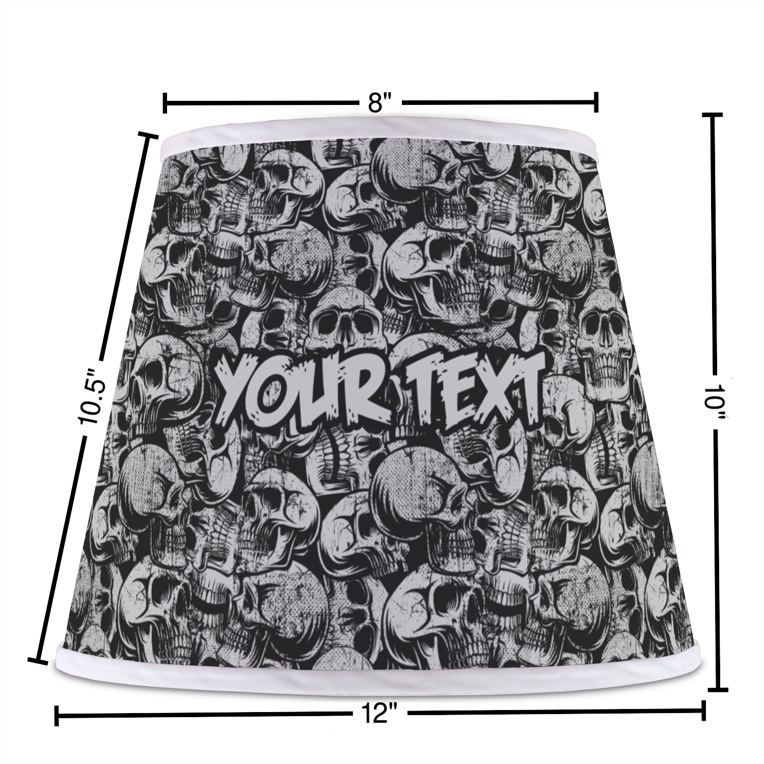 The base of this lampshade is 12 inches in diameter, and the top spans 8 inches in diameter. The total height of the lampshade is 10 inches. The angled nature of this custom lampshade concentrates the light, making it ideal for smaller spaces. This lampshade is made of matte, polyfilm, and displays your customization in its middle. The top and bottom of this colorful lamp shade are lined with a white fabric ribbon (which can be replaced with black inside the design studio) which frames your design and creates a sophisticated finish. As an UNO fitter lampshade, this unique lamp shade will fit a variety of bases.