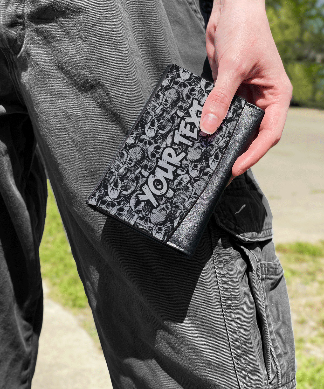 This design has a cool background with skulls facing every which way. They are all grey and black. You are able to personalize you design with the text that is placed at the bottom of the design. This really is the perfect design for your hardcore man!