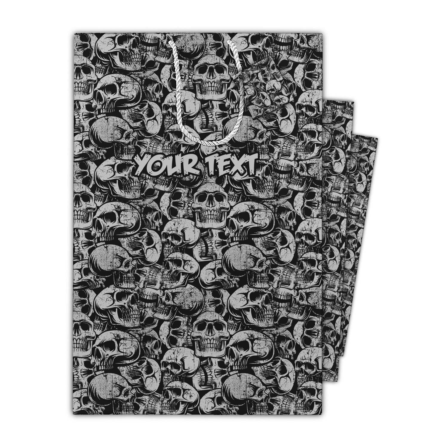 This design has a cool background with skulls facing every which way. They are all grey and black. You are able to personalize you design with the text that is placed at the bottom of the design. This really is the perfect design for your hardcore man!