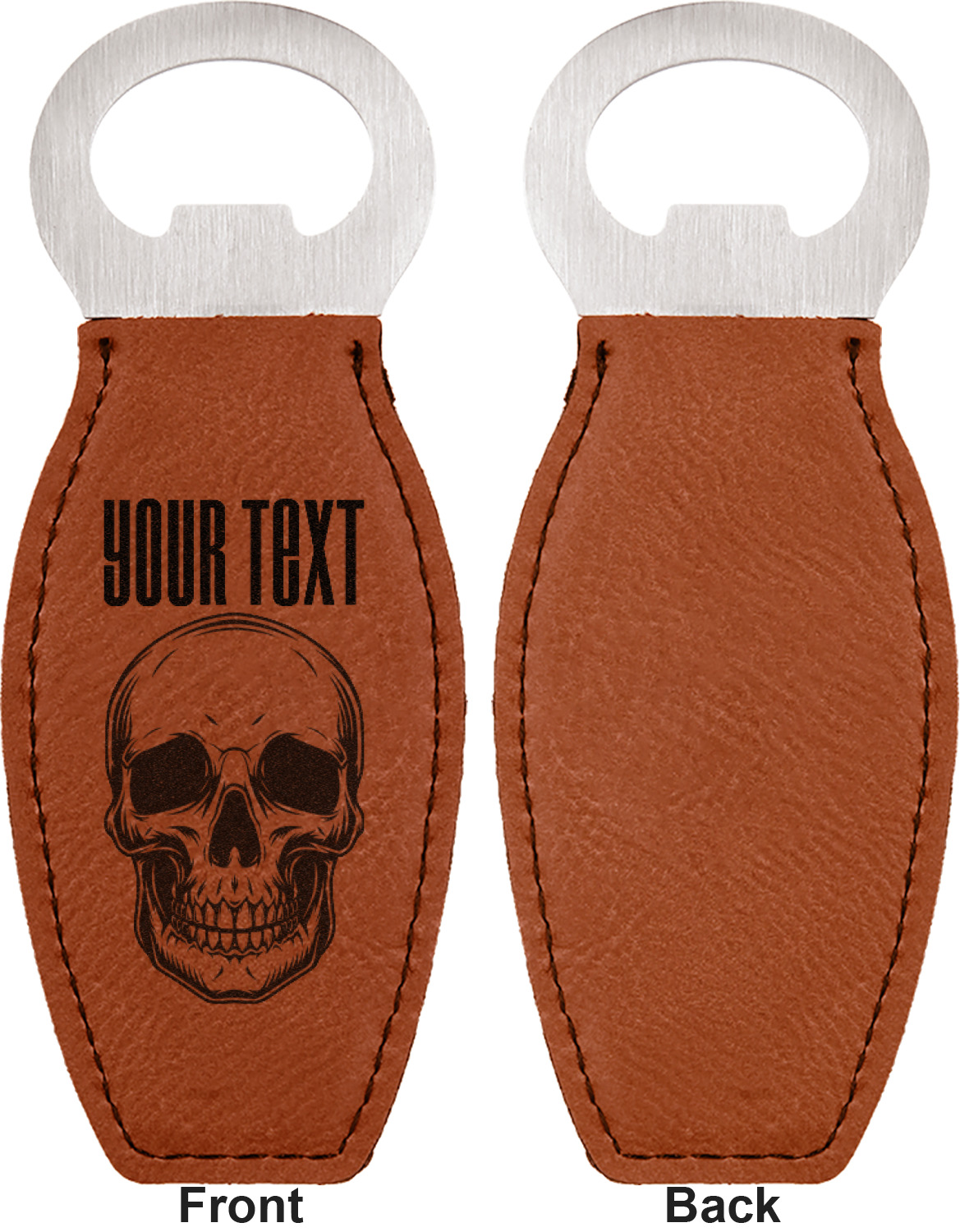Built from stainless steel, these custom bottle openers are wrapped in a cognac-colored leatherette. Sharp, black stitching lines the edges for extra durability and a finished touch. Your personalization is laser-engraved onto the surface of this leatherette, leaving behind a crisp, black coloration. At 4.6 by 1.8 inches, this beer bottle opener gives you much of leverage when trying to open a stubborn bottle. On the opposite end of the opener, you'll find a magnet that you can use to display your new, unique bottle opener!