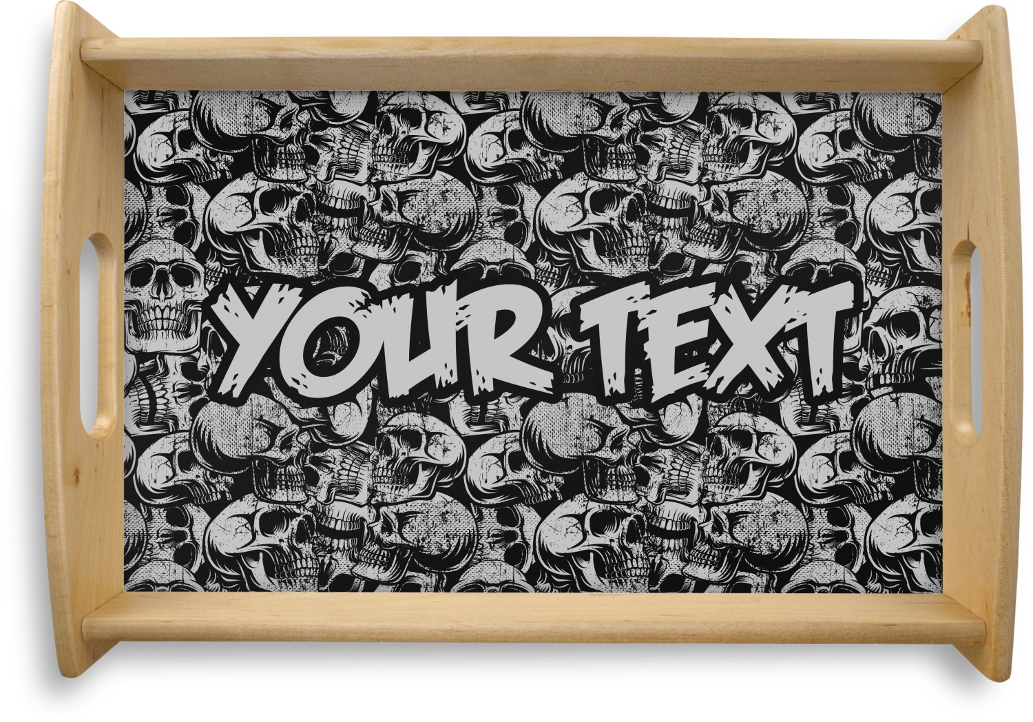 This serving tray with handles features square edges and two rounded sides, creating a very modern look. Each side is fabricated from a beautifully cut, natural wood. The bottom of the interior of the tray displays your customized design in bright, vibrant color. The tray is sold in both a black color and a natural wood look. Each variation of the wood serving tray has two sizes: Small, which is 14" x 10" x 2.25", and Large, which is 19.5" x 13.5" x 2.75".