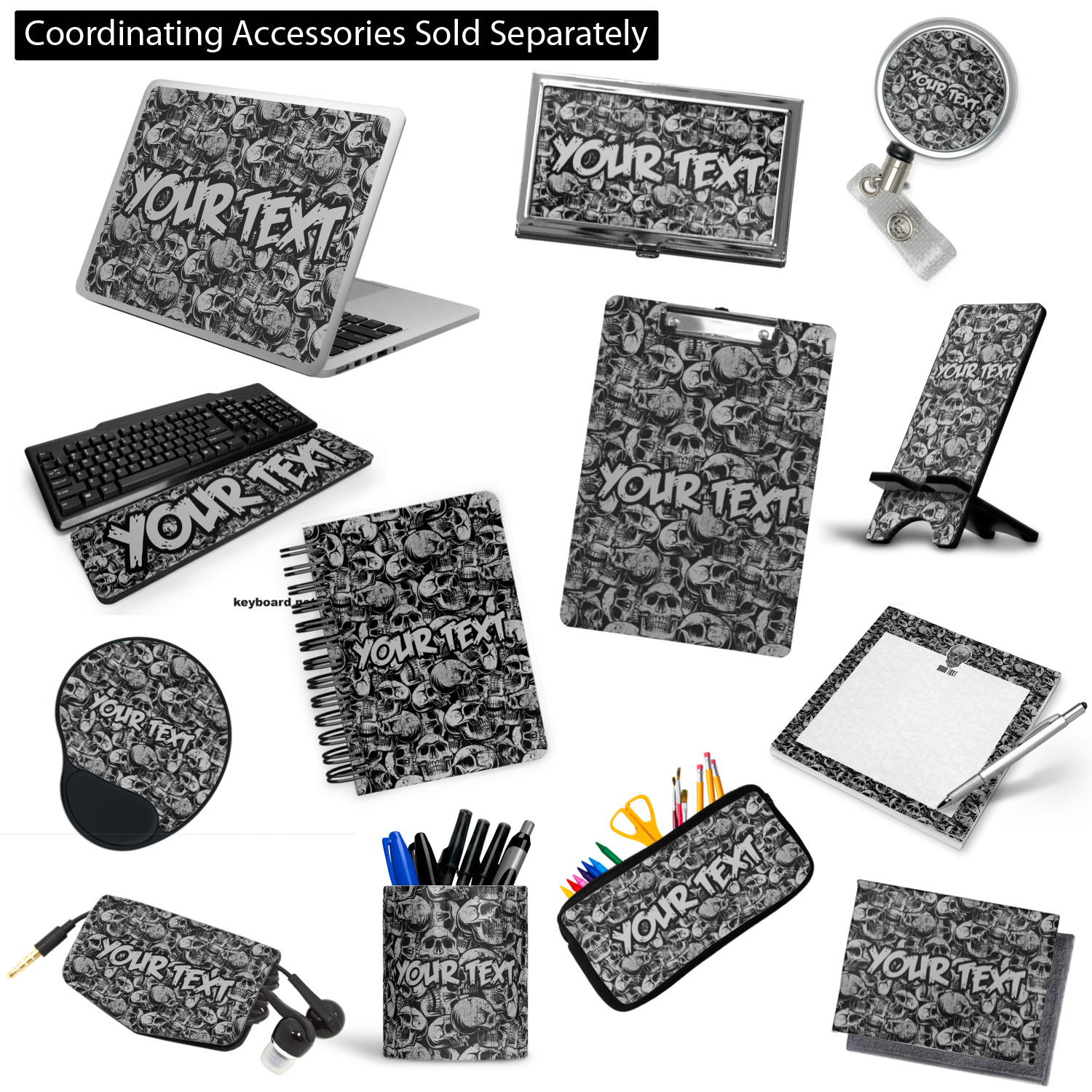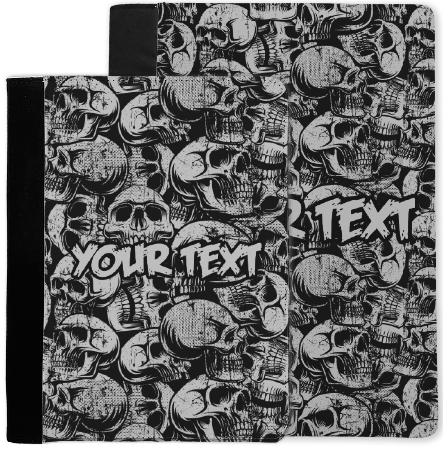 This design has a cool background with skulls facing every which way. They are all grey and black. You are able to personalize you design with the text that is placed at the bottom of the design. This really is the perfect design for your hardcore man!