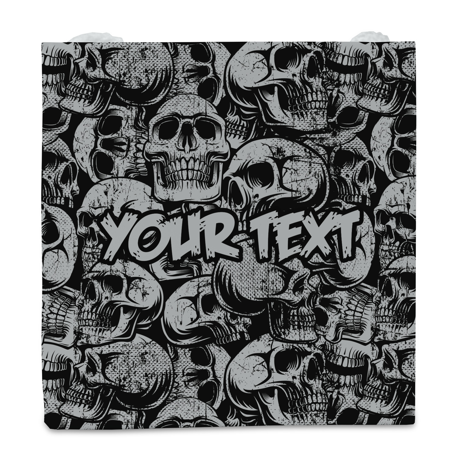 This design has a cool background with skulls facing every which way. They are all grey and black. You are able to personalize you design with the text that is placed at the bottom of the design. This really is the perfect design for your hardcore man!