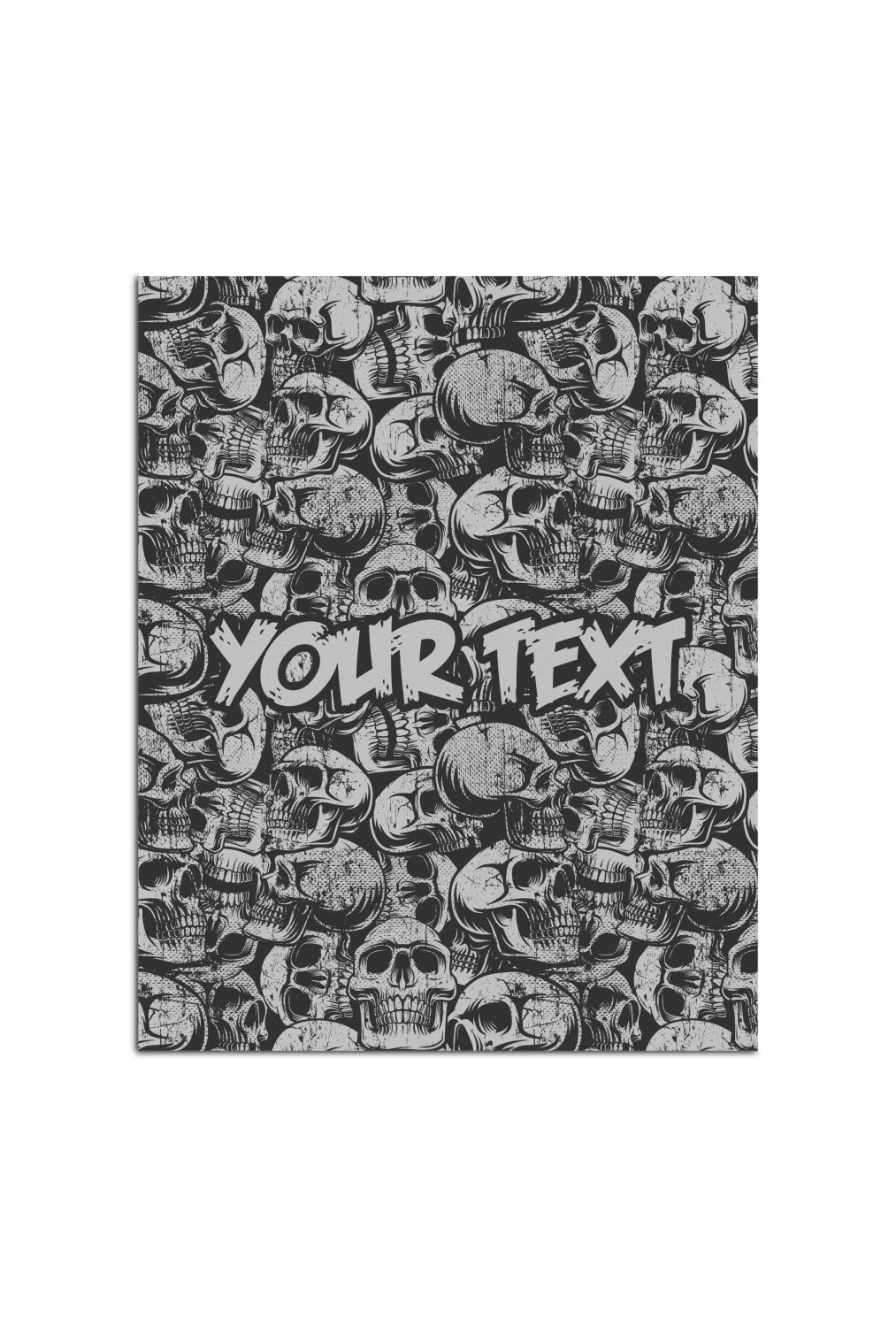 This design has a cool background with skulls facing every which way. They are all grey and black. You are able to personalize you design with the text that is placed at the bottom of the design. This really is the perfect design for your hardcore man!