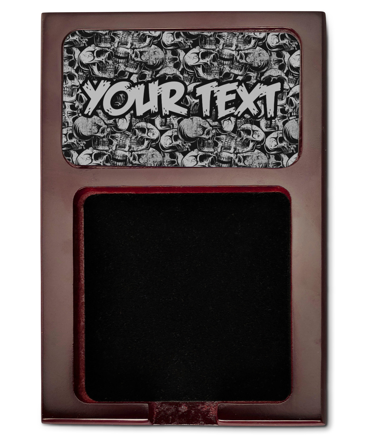 This design has a cool background with skulls facing every which way. They are all grey and black. You are able to personalize you design with the text that is placed at the bottom of the design. This really is the perfect design for your hardcore man!