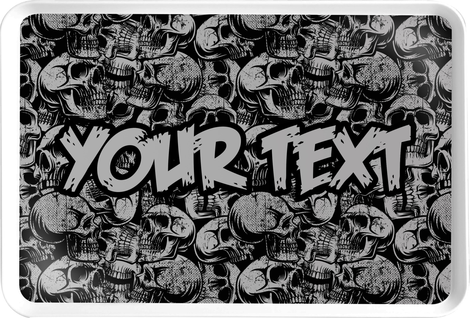 This design has a cool background with skulls facing every which way. They are all grey and black. You are able to personalize you design with the text that is placed at the bottom of the design. This really is the perfect design for your hardcore man!