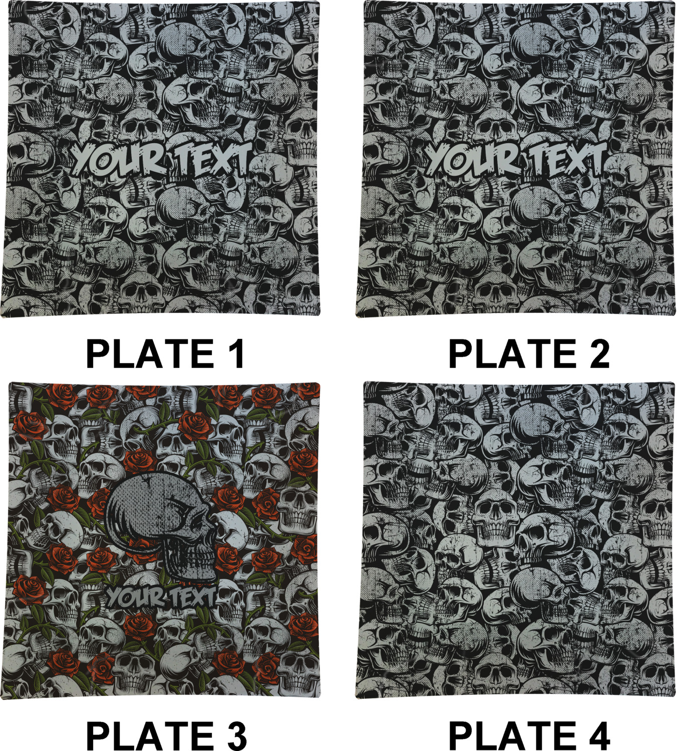 This design has a cool background with skulls facing every which way. They are all grey and black. You are able to personalize you design with the text that is placed at the bottom of the design. This really is the perfect design for your hardcore man!