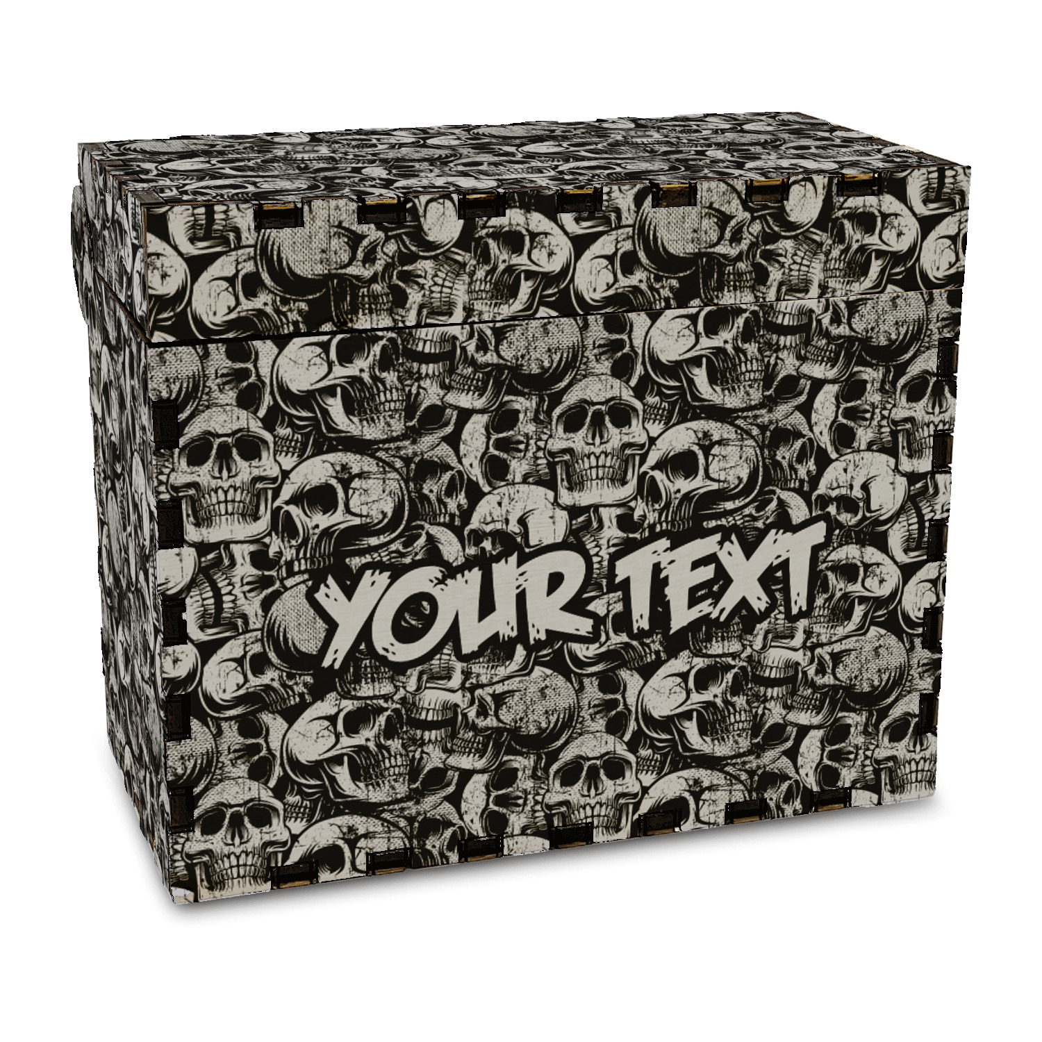 This design has a cool background with skulls facing every which way. They are all grey and black. You are able to personalize you design with the text that is placed at the bottom of the design. This really is the perfect design for your hardcore man!