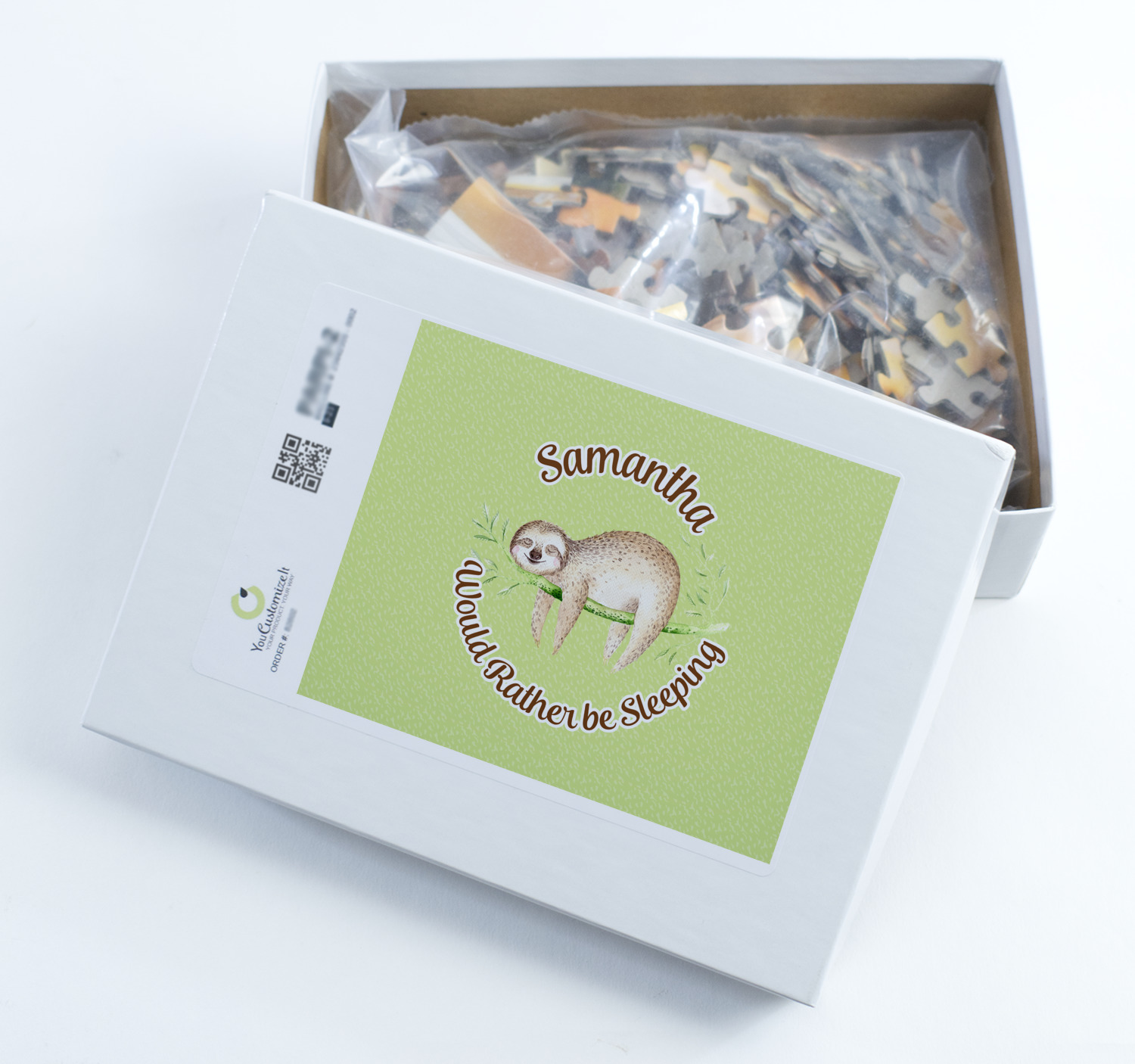 We print our puzzles on thick white chipboard in vibrant colors, then laminate the chipboard and die cut your puzzle. Your jigsaw puzzle is shipped to you in a box with the image of the puzzle on the box.