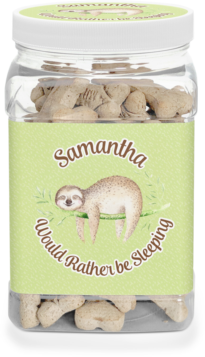 This half gallon jar, made from a sturdy plastic, is the perfect way to keep treats from any naughty pet paws, while still keeping them ready on hand for when your pup performs an impressive trick. This dog cookie jar features a screw-on, white lid that displays your personalized design on a vinyl sticker. We apply another customized sticker that wraps around the front and sides of the jar. Our dog treat jar also has indentations on the rear ends of the sides, which allows for convenient handling, and its square frame allows for easy storage.