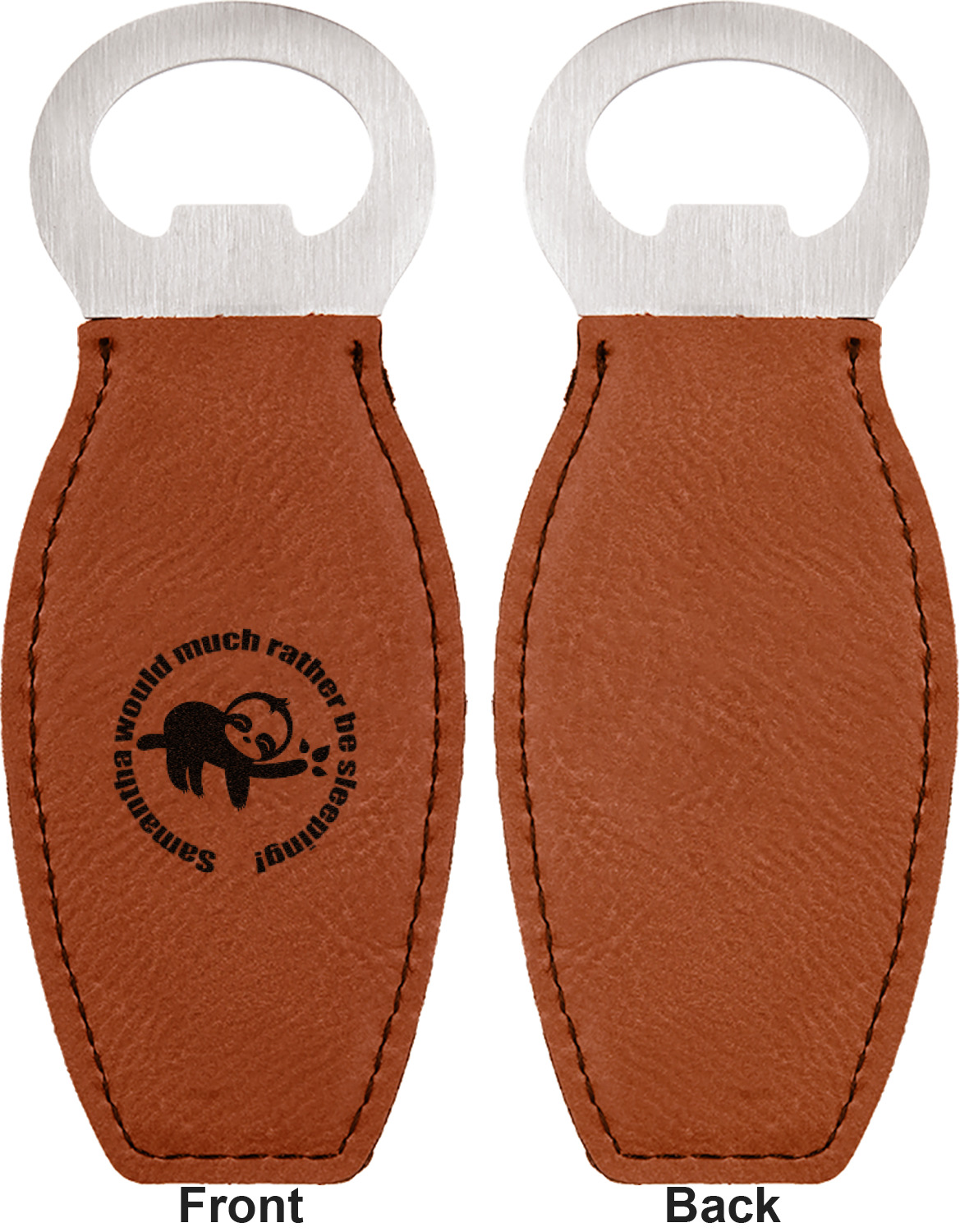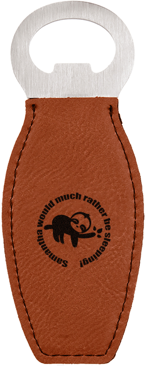 Built from stainless steel, these custom bottle openers are wrapped in a cognac-colored leatherette. Sharp, black stitching lines the edges for extra durability and a finished touch. Your personalization is laser-engraved onto the surface of this leatherette, leaving behind a crisp, black coloration. At 4.6 by 1.8 inches, this beer bottle opener gives you much of leverage when trying to open a stubborn bottle. On the opposite end of the opener, you'll find a magnet that you can use to display your new, unique bottle opener!
