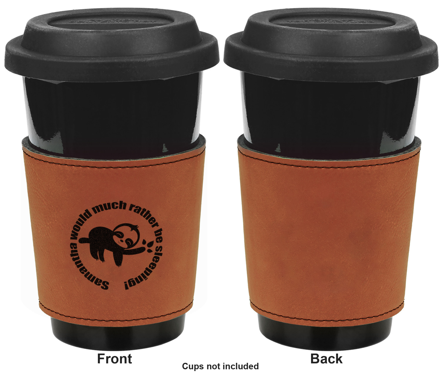 This cup sleeve is made from a suave, cognac-brown leatherette and finished with an intricate, black stitch. The interior of this can sleeve is fabricated from a thin foam material to help insulate your mug's contents. The sleeve is specifically made to suit tapered glasses or mugs, so the top's diameter is 3.5 inches, while the bottom's diameter is 2.75 inches. Your customized design will be laser engraved into the leatherette, leaving behind crisp, black imprint. With these products, we provide you with the option of engraving the front and back, or the front only.