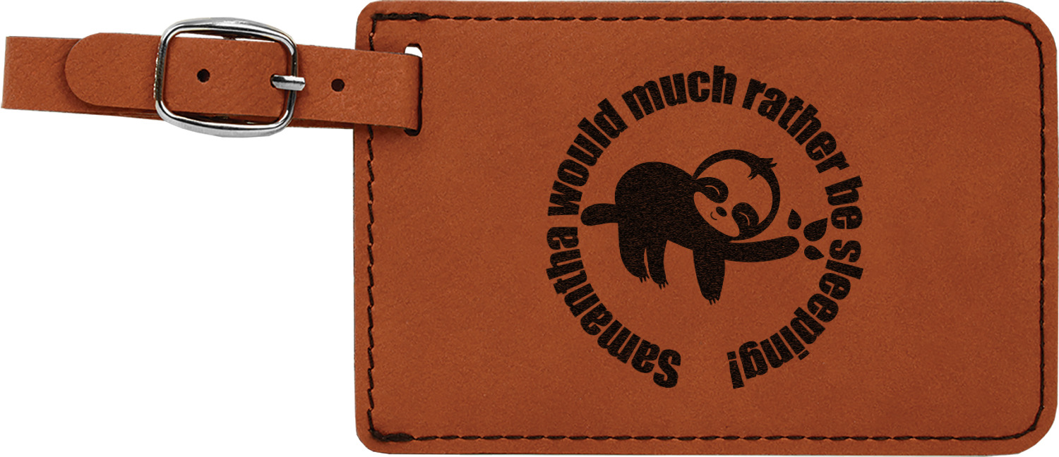 This luggage tag will surely be able to get you started in having all the right tools for traveling. It is made of a beautiful leatherette material that is a nice shade of cognac brown. The front of the tag is where your design goes. The sturdy black stitching gives your design an extra pop and gives the tag extra durability. The back of the tag has a clear vinyl window where you can slip in your address card. The tag comes with a great little buckle strap that you can easily use to clip to your suitcase. The tag itself measures at approximately 5.5"W x 4.25"H.