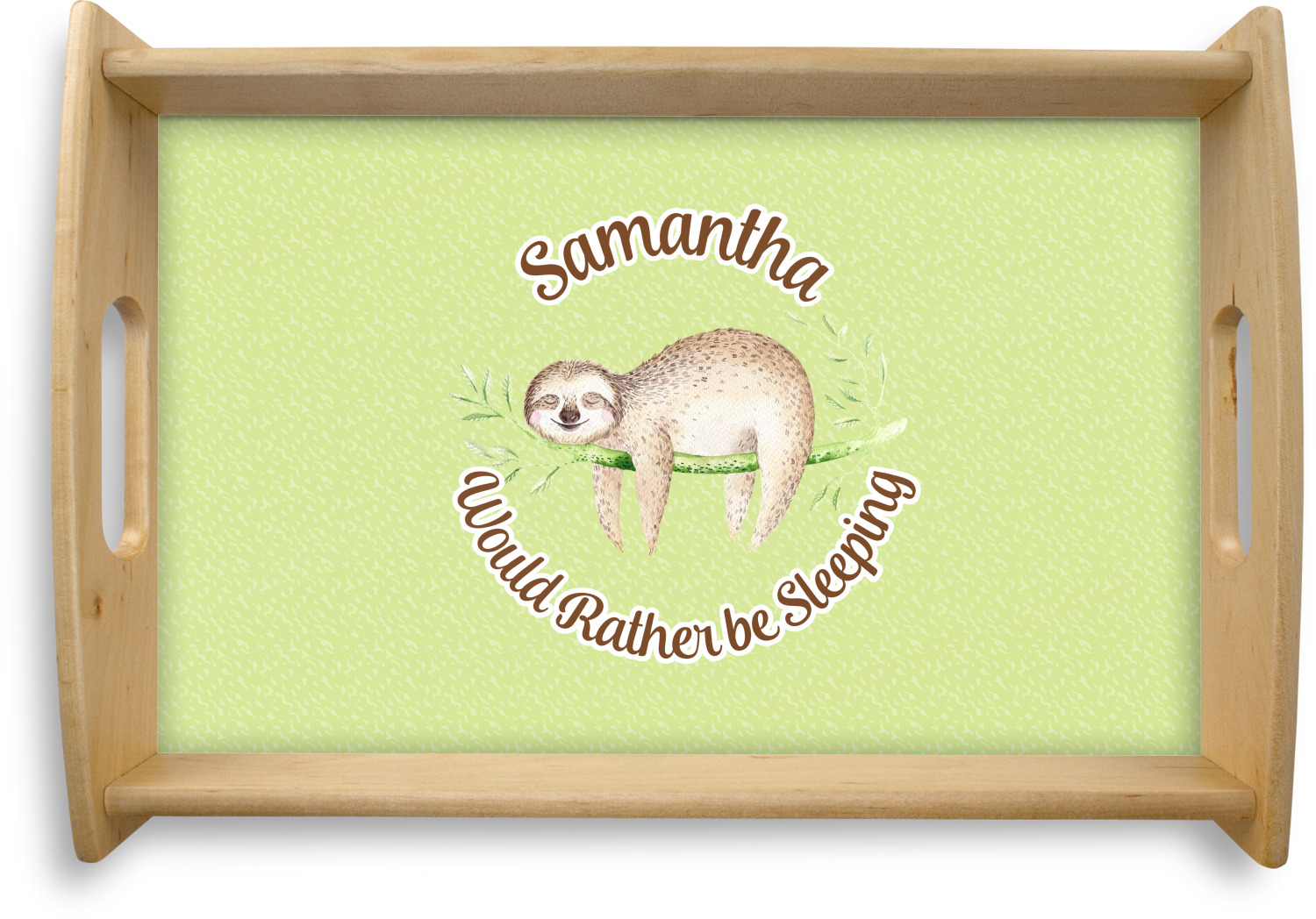 This serving tray with handles features square edges and two rounded sides, creating a very modern look. Each side is fabricated from a beautifully cut, natural wood. The bottom of the interior of the tray displays your customized design in bright, vibrant color. The tray is sold in both a black color and a natural wood look. Each variation of the wood serving tray has two sizes: Small, which is 14" x 10" x 2.25", and Large, which is 19.5" x 13.5" x 2.75".