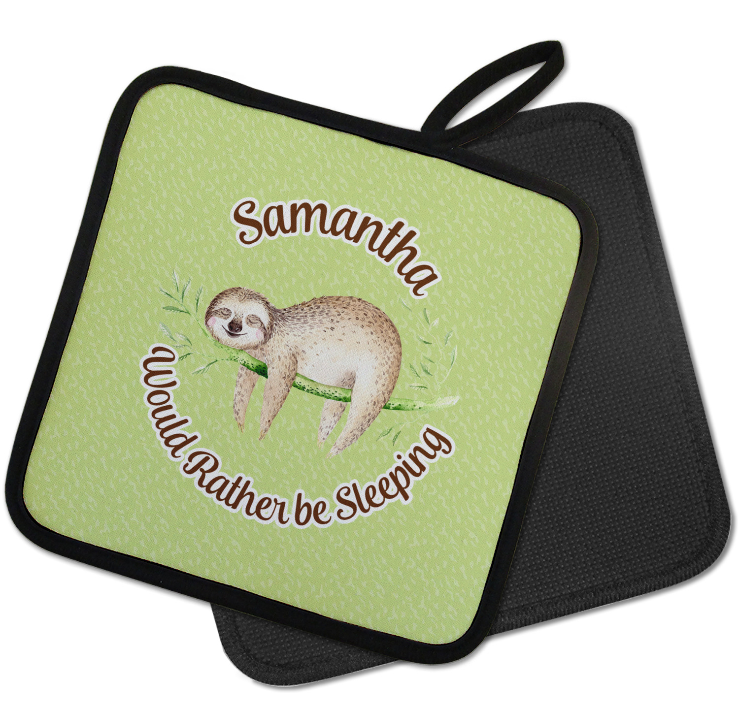 Our personalized pot holders feature a neoprene front that displays your personalization in vibrant colors. The backing of the hot pot holder is rubberized; the textured backing allows you to have a great grip when using this custom pot holder. The two materials are joined with a sleek, black trim, and the holder also includes an attached loop for hanging and storage. The pot holder is approximately 8.75 inches by 8.75 inches and 0.25 inches tall, while the fabric loop is 2.5 inches long. You can purchase a kitchen pot holder by itself or as a set of 2. We also offer a set including one pot holder and one oven mitt.