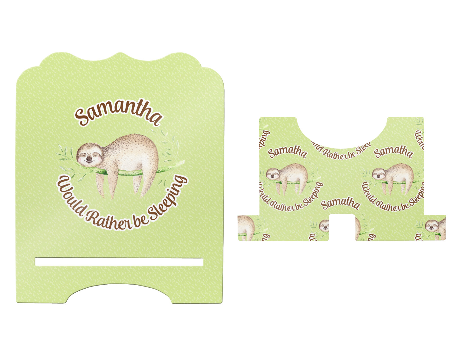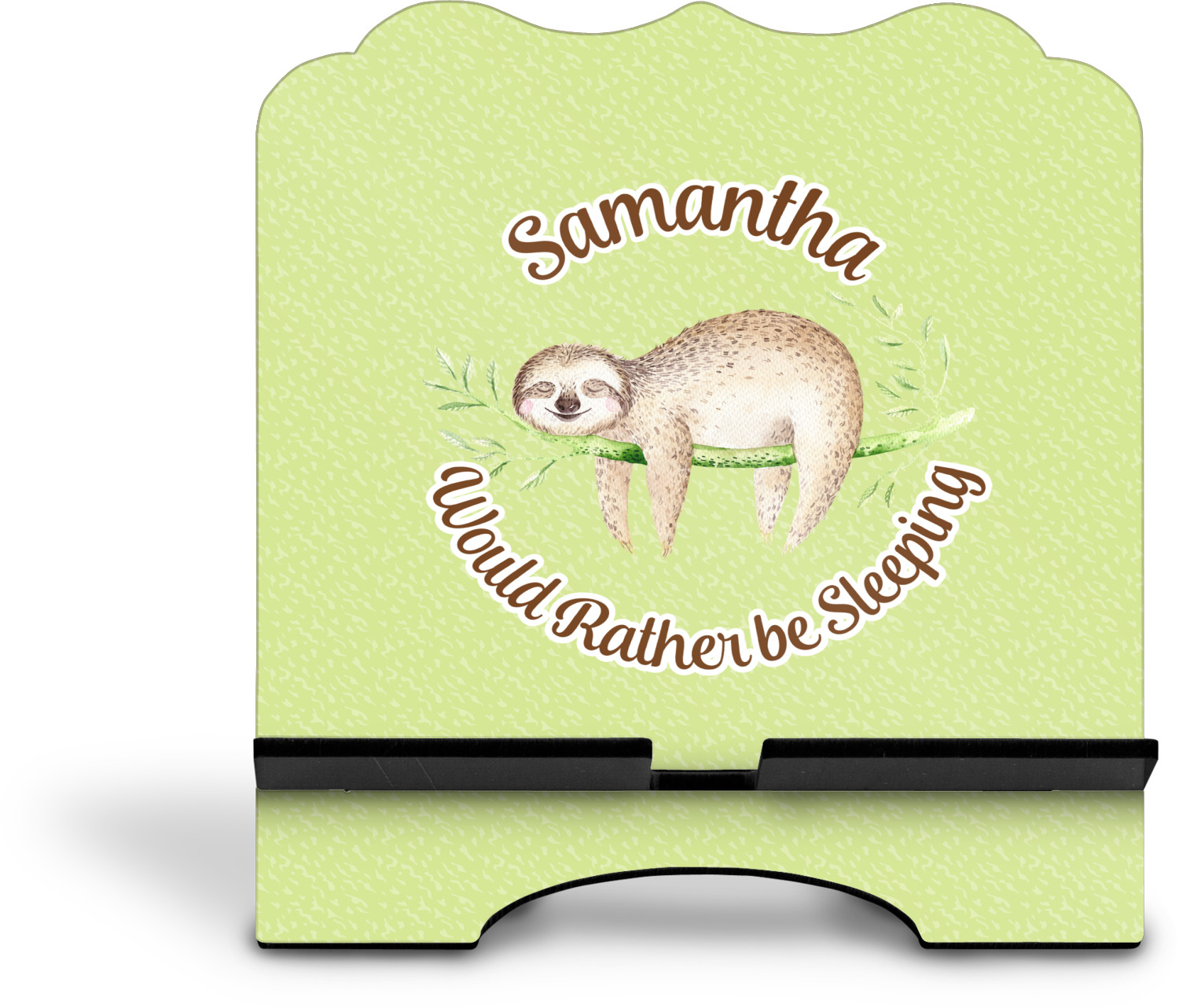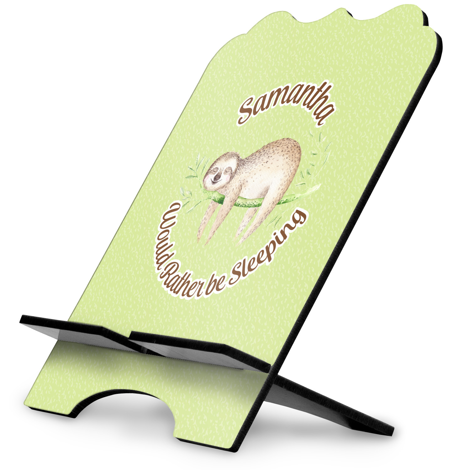 The stand is comprised of two hardboard pieces that fit snugly together and stabilize one another. The bottom part of the iPad stand supports your tablet, and has space for your tablets charger while in use. At 9.25" x 11.5", this tablet mount can support a device between the sizes of the iPad Pro and the iPad Mini 2. The uppermost part of the stand features a decorative, curved edge for a classy, suave appearance. We print your customization atop the face of the stand, in vibrant color. The remaining sides are colored a sleek black.