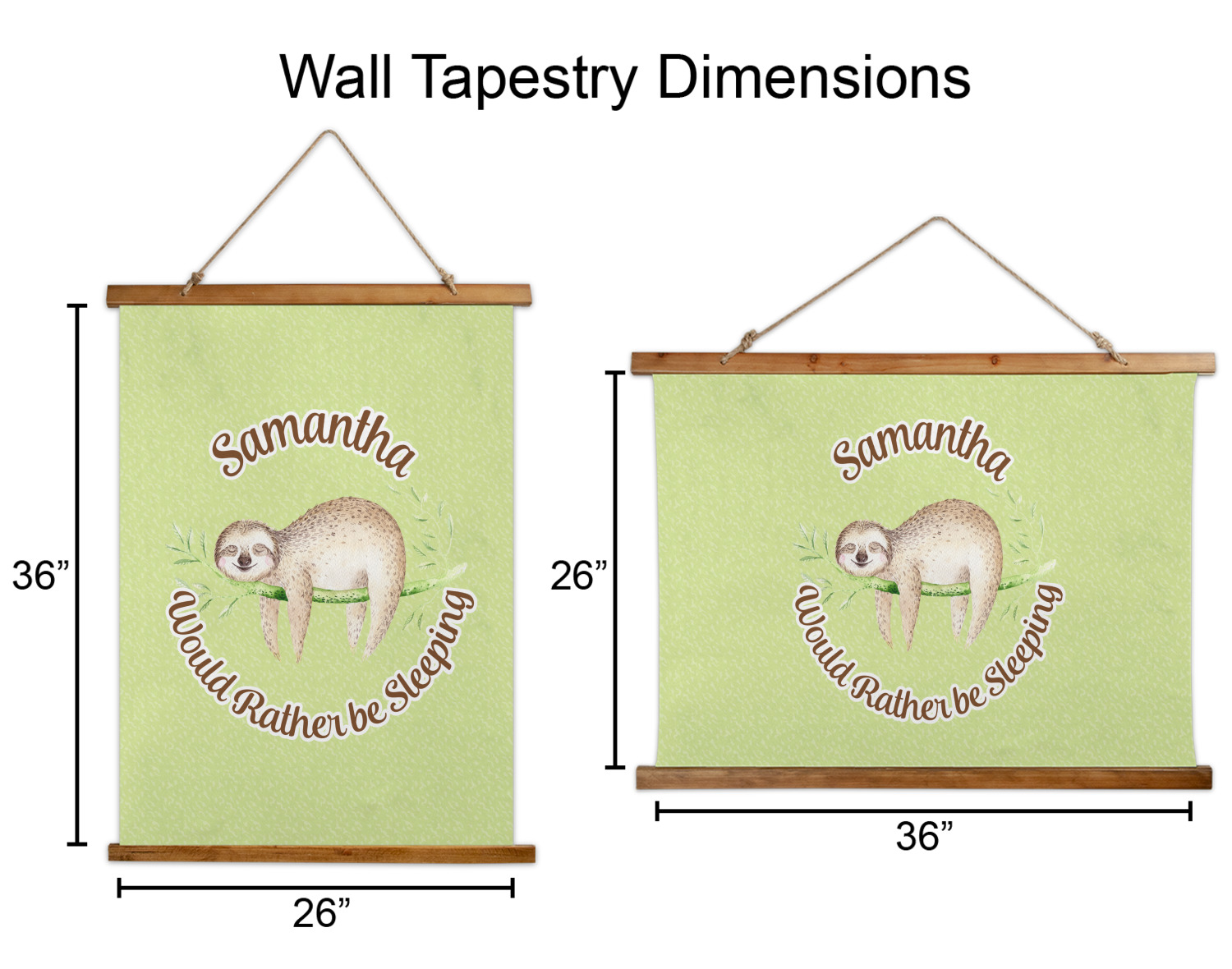 Made in two different orientations - portrait or landscape - both are 26" x 36". Your design is printed on a high quality polyester fabric with hemmed edges. The wood on the top and bottom of the tapestry is 1.25" tall and 0.25" thick and there are two pieces on top and bottom which sandwich the fabric.