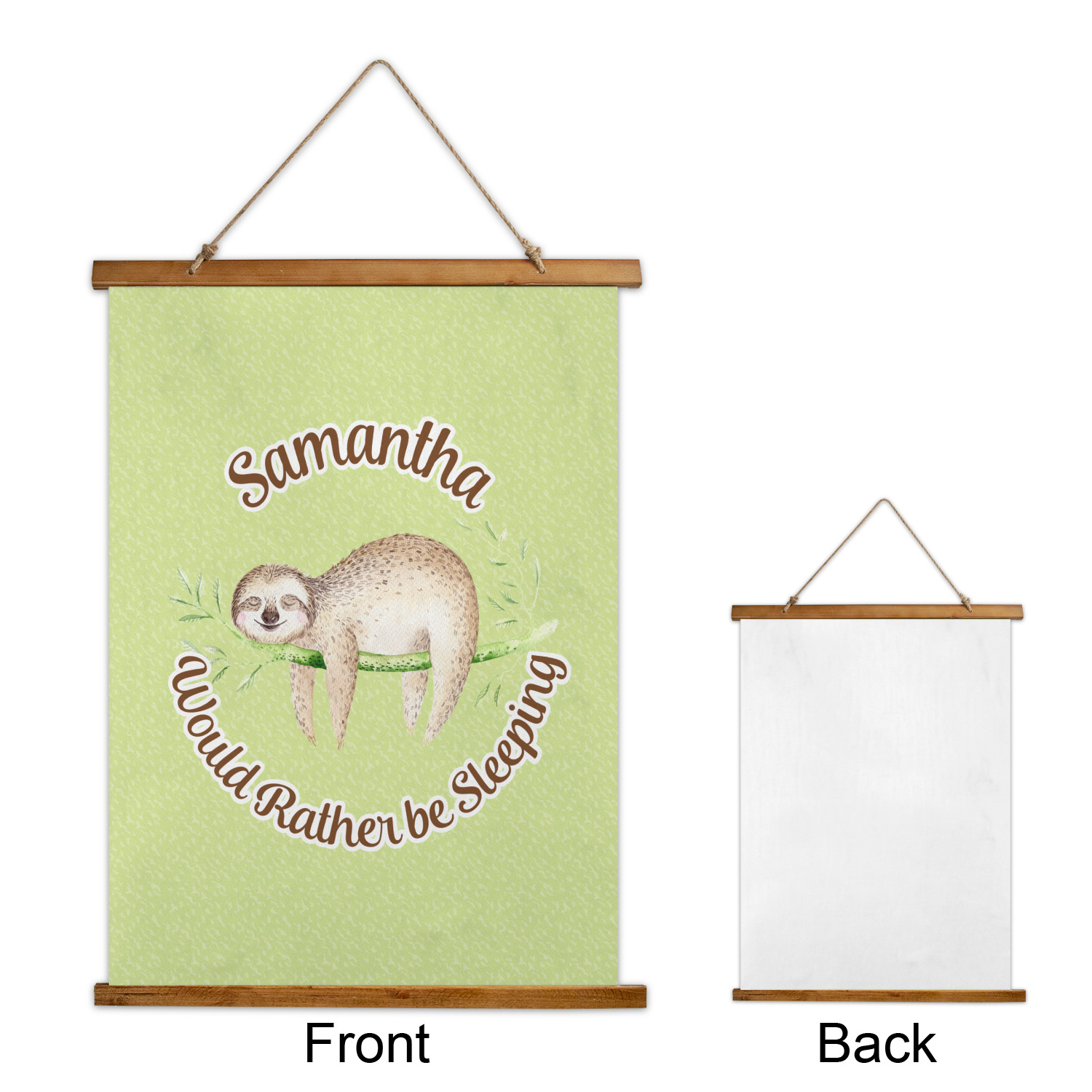 Made in two different orientations - portrait or landscape - both are 26" x 36". Your design is printed on a high quality polyester fabric with hemmed edges. The wood on the top and bottom of the tapestry is 1.25" tall and 0.25" thick and there are two pieces on top and bottom which sandwich the fabric.