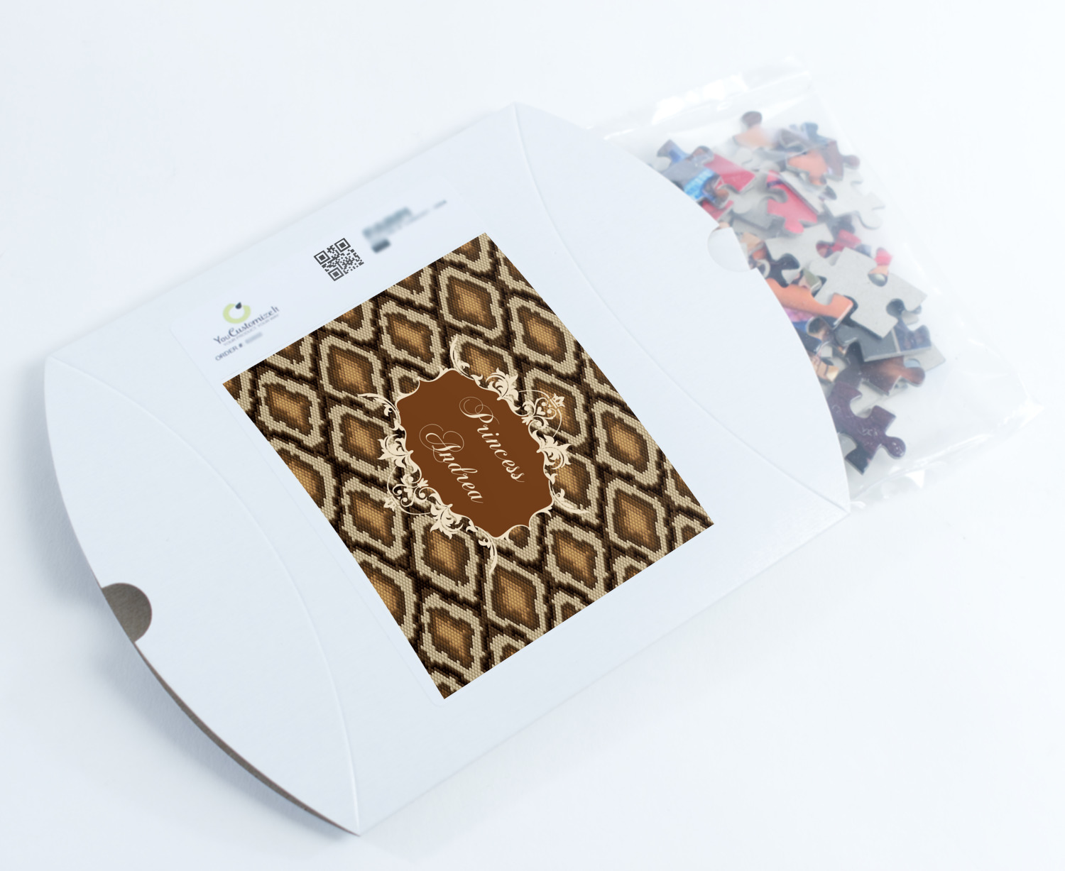 Snake skin print is currently trending and so we created this incredibly beautiful design with a snake skin background in classic browns and beige. The gorgeous label is one of the labels in our floral frames collection. It looks like a crown and thus we chose the personalization to include "princess".