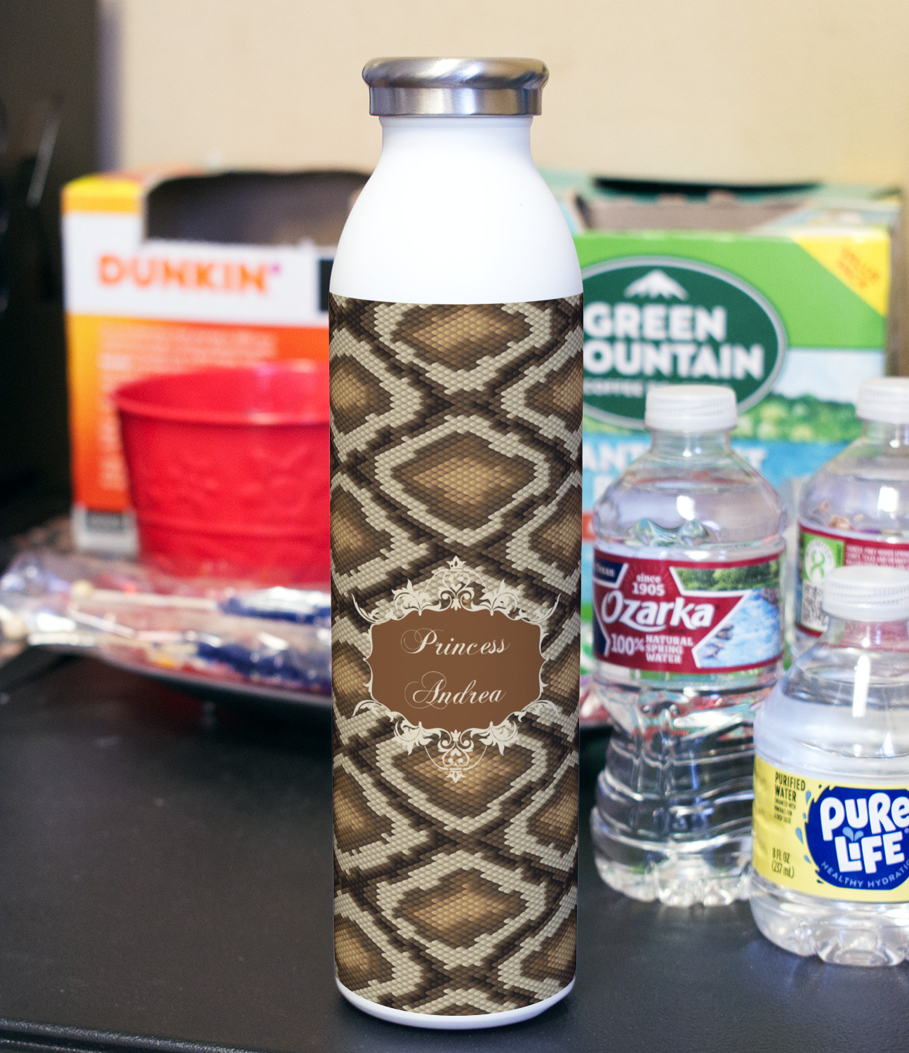 Snake skin print is currently trending and so we created this incredibly beautiful design with a snake skin background in classic browns and beige. The gorgeous label is one of the labels in our floral frames collection. It looks like a crown and thus we chose the personalization to include "princess".