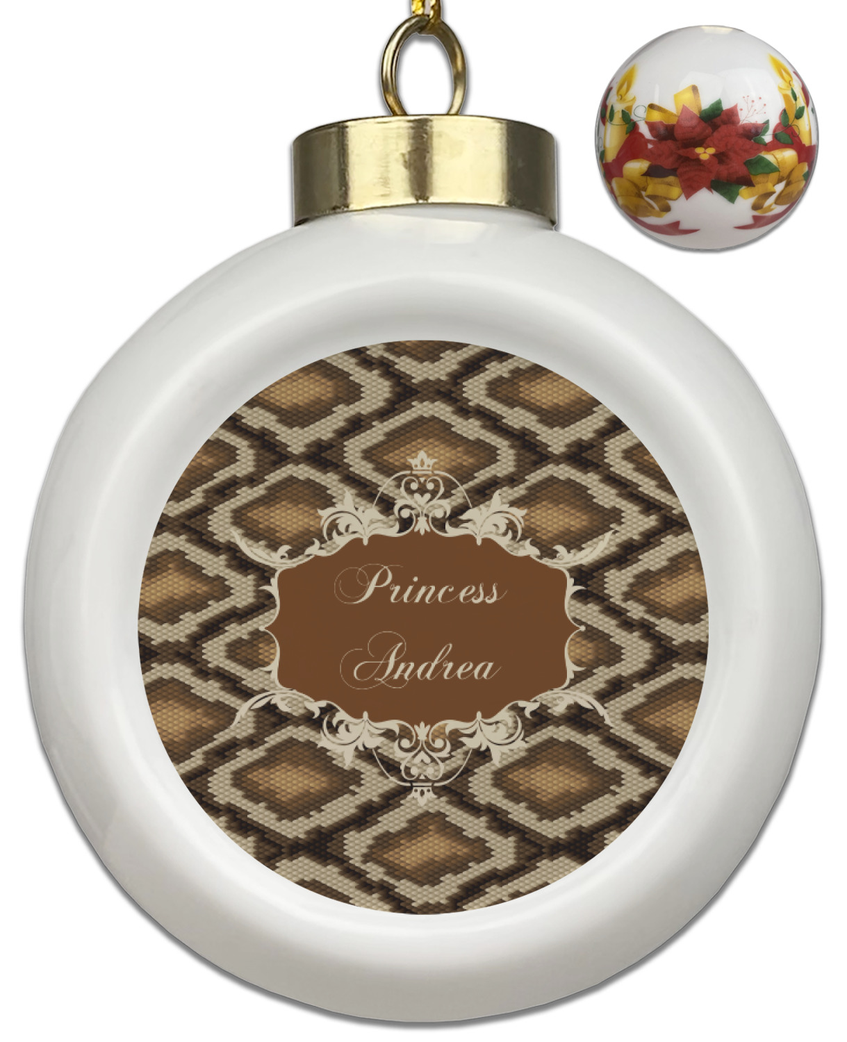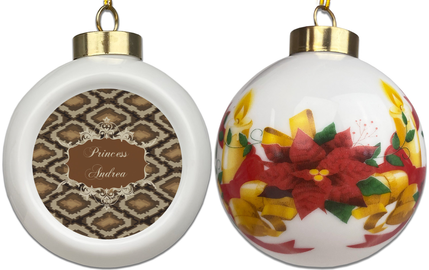 Our Christmas ornaments are a unique ceramic ball shape with a twist as it has a flat face to display your custom design! Select from one of our two design types - Christmas Tree or Poinsettia Garland - to adorn the curved back of your personal design. Each ornament measures 3H x 2.5W x 2D accompanied with a gold string accent for finishing touches to hang on your beautiful Christmas tree!