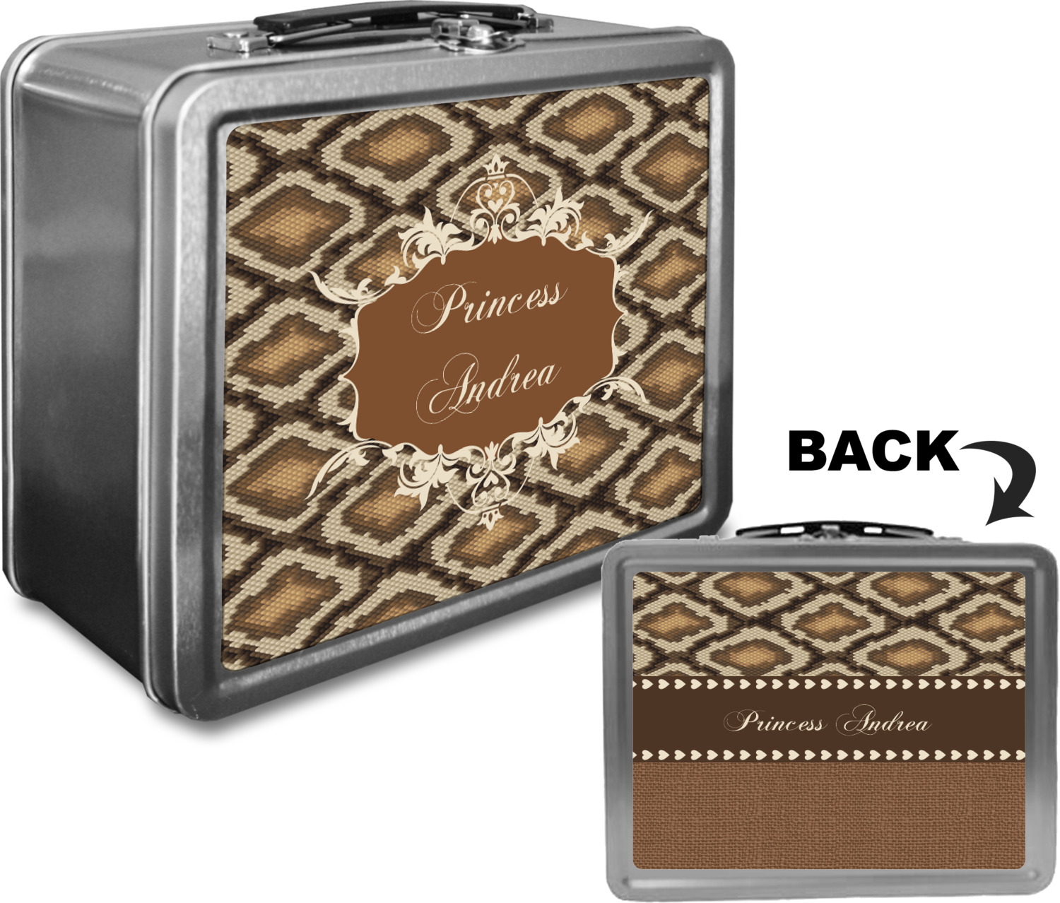 Snake skin print is currently trending and so we created this incredibly beautiful design with a snake skin background in classic browns and beige. The gorgeous label is one of the labels in our floral frames collection. It looks like a crown and thus we chose the personalization to include "princess".