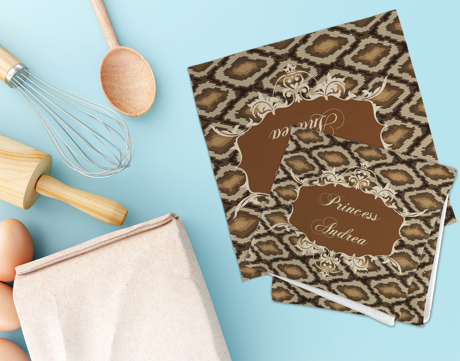 Snake skin print is currently trending and so we created this incredibly beautiful design with a snake skin background in classic browns and beige. The gorgeous label is one of the labels in our floral frames collection. It looks like a crown and thus we chose the personalization to include "princess".
