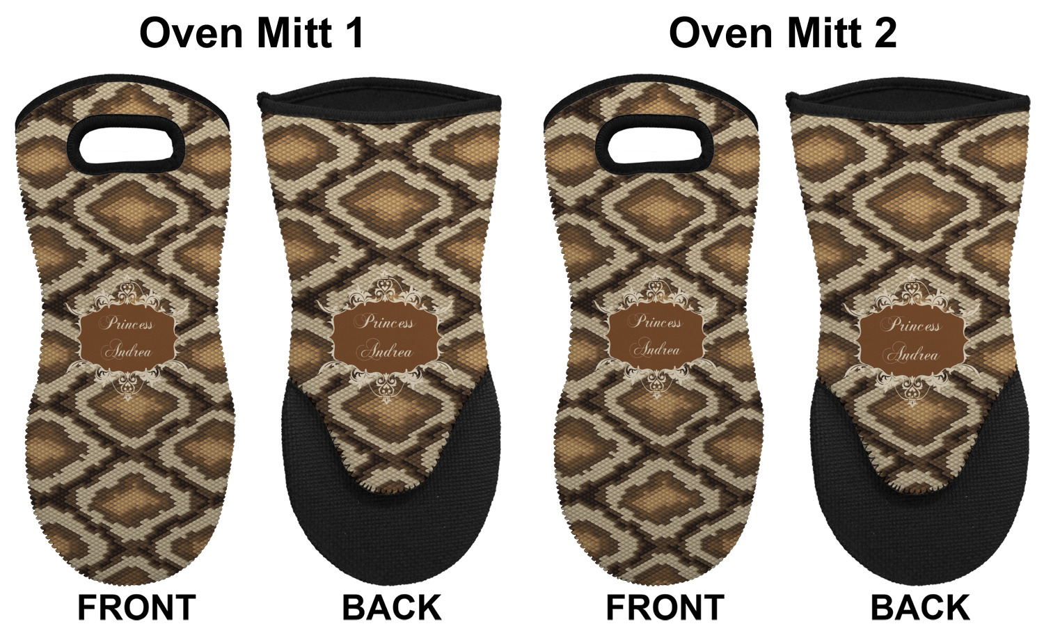 These heat resistant gloves are made entirely of a durable neoprene; the front features a softer texture, while the palm's side has a textured surface, meant to handle heat up to 500 degrees Fahrenheit. Thick, heavy duty stitching connects the two sides. A small, oval cutout appears on the front, and can be used to hang and store the mitt. Your personalization appears on the front, and the upper part of the back of the mitt. The style of these oven mitts are suitable for both the right and left hand, depending on your needs. If you need one for each hand, be sure to order two!