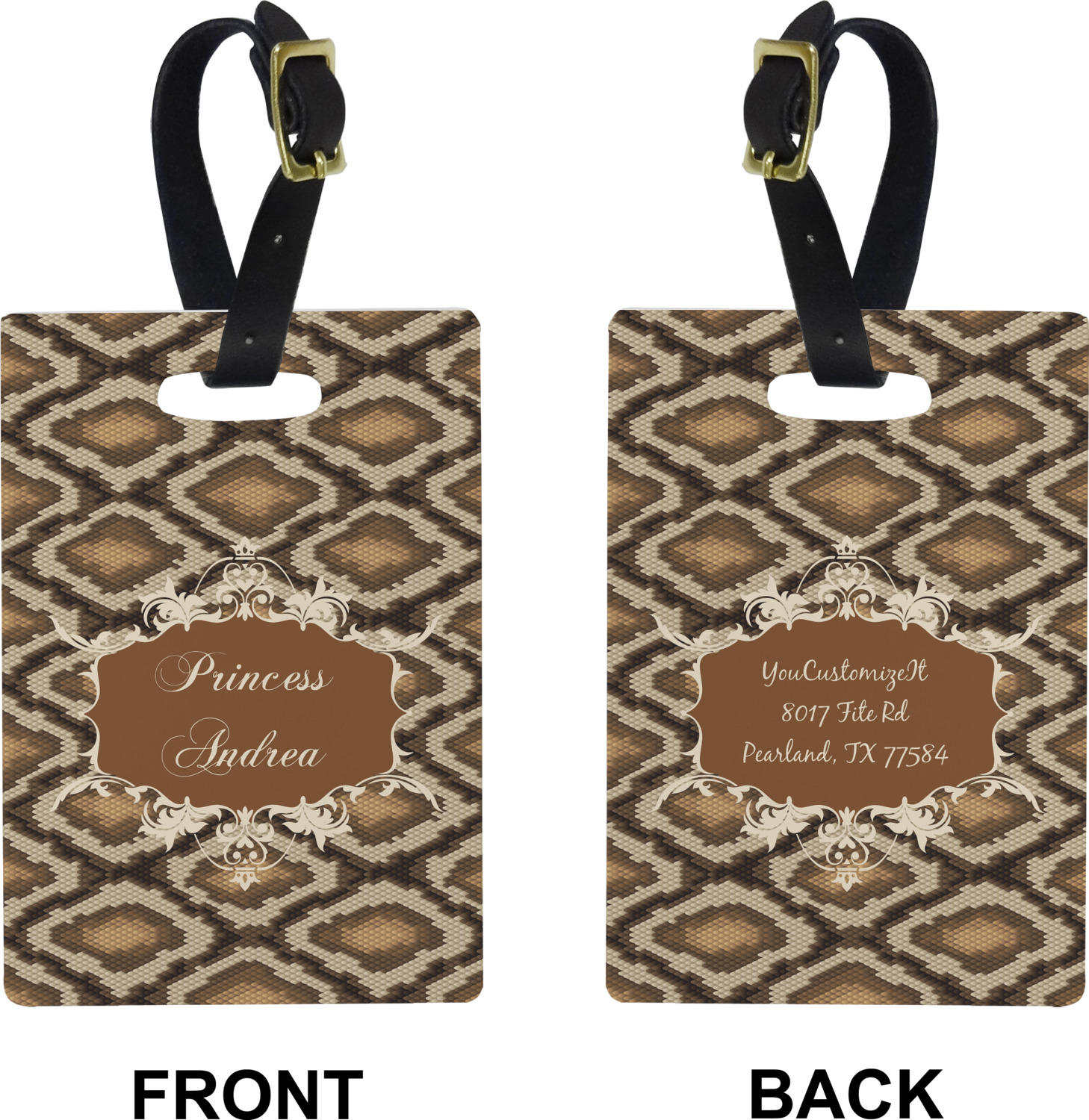 These personalized bag tags are sold in a variety of shapes, so that you may find the product that meets your vision exactly. We sell a round luggage tag, which measures at approximately 4" x 4". Our square luggage tag is about 3.5" x 3.5", while our rectangular version is 2.75" x 4 ".