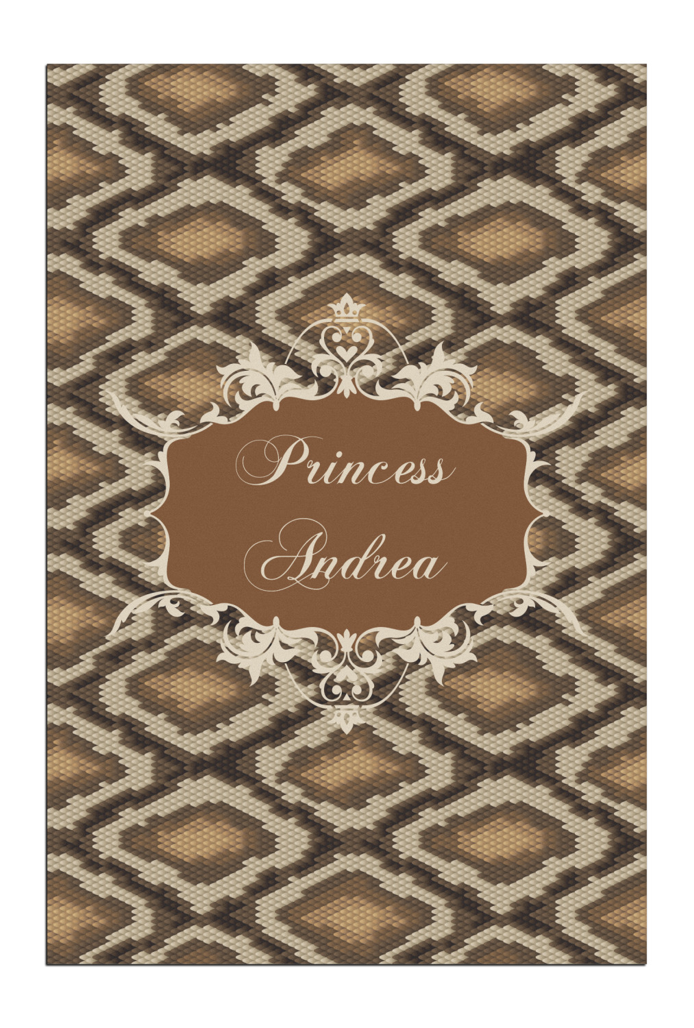 Snake skin print is currently trending and so we created this incredibly beautiful design with a snake skin background in classic browns and beige. The gorgeous label is one of the labels in our floral frames collection. It looks like a crown and thus we chose the personalization to include "princess".