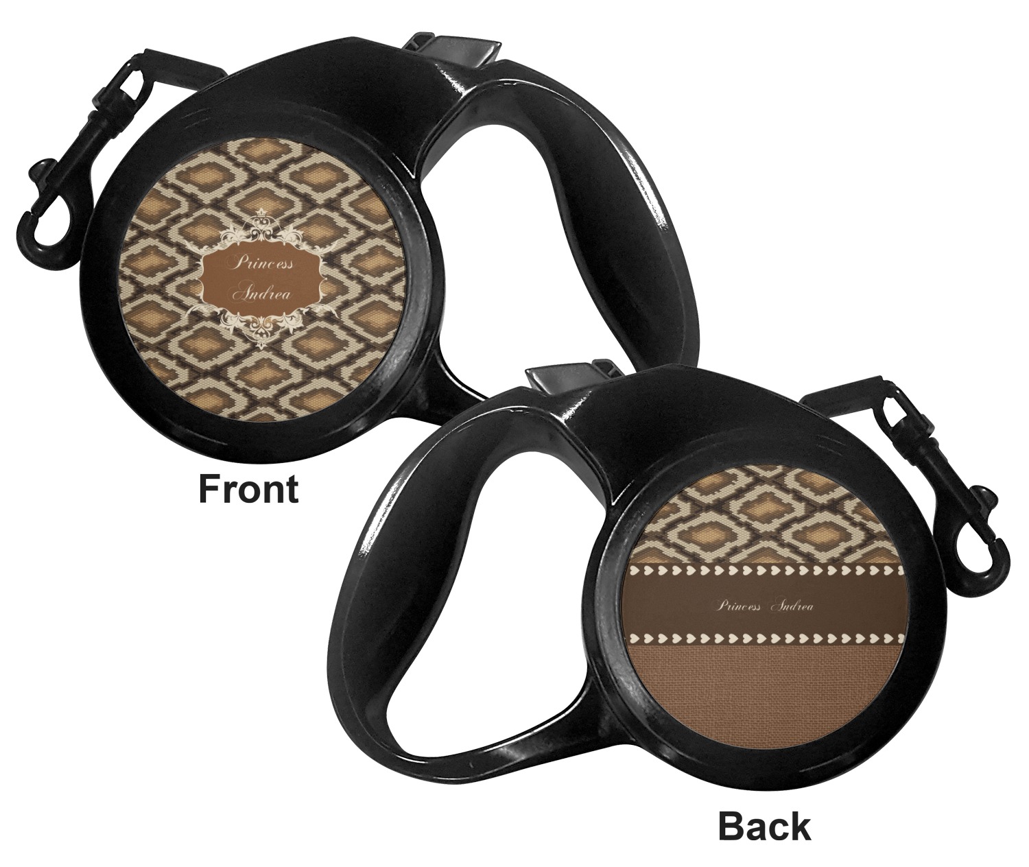 The leash's plastic handle is accommodating of your grip and displays your customization on both sides. The dog leash also features the traditional bolt snap clip, for easy fastening to your dog's collar. The leash and leash handle themselves are both black in color.