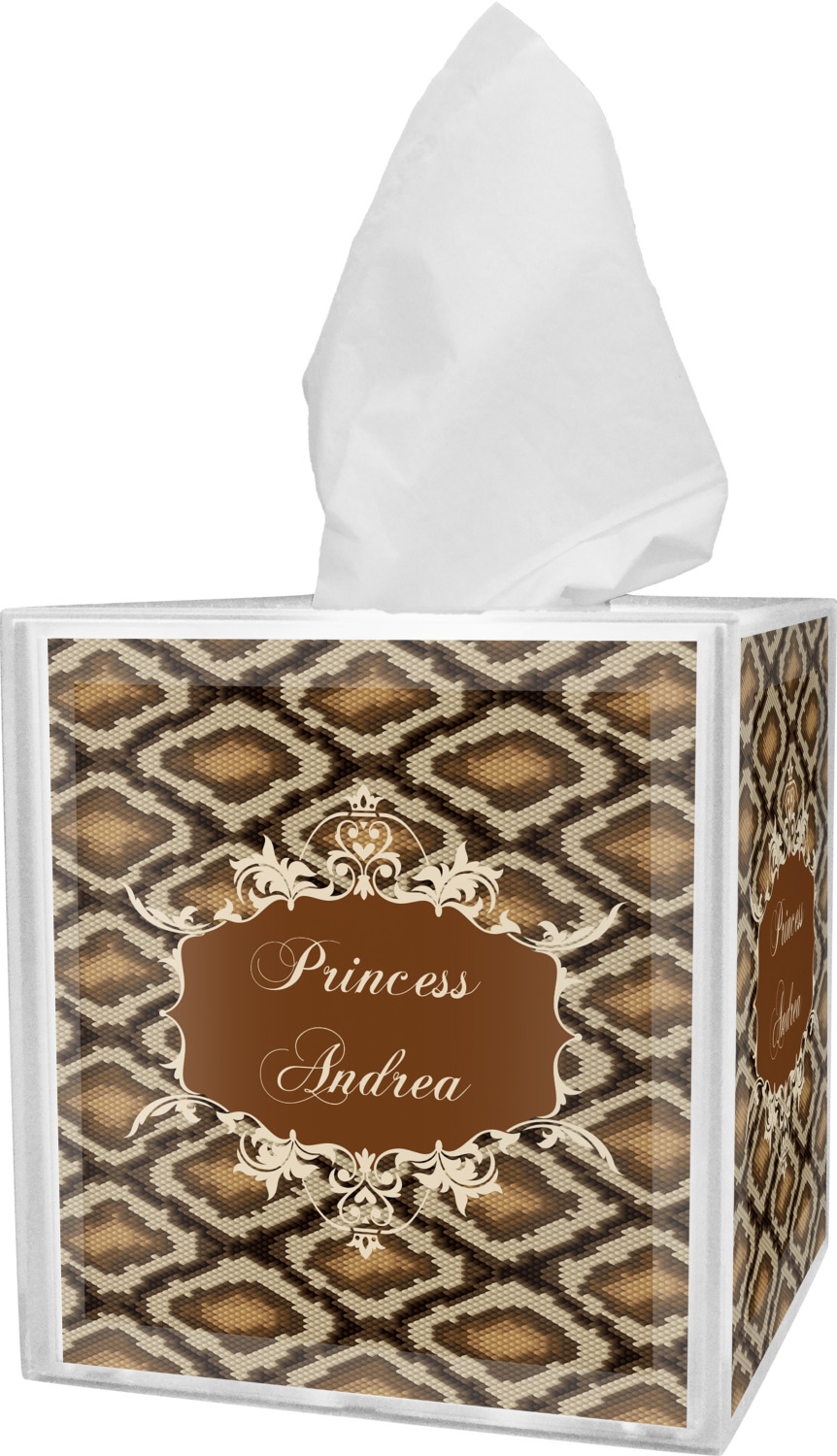 These tissue holders are built from durable acrylic and display your unique personalization on fine-quality vinyl inserts placed within the four sides and top. The box features two pieces, allowing you to easily switch out tissue boxes. On the sides, youll find ridges that ensure the top and base fit securely in place. The bottom of these tissue box holders has four, rubber, non-slip pads to prevent the box from scuffing any surface you decide to display it on. Each box can fit a standard 5 by 5-inch box of tissues.