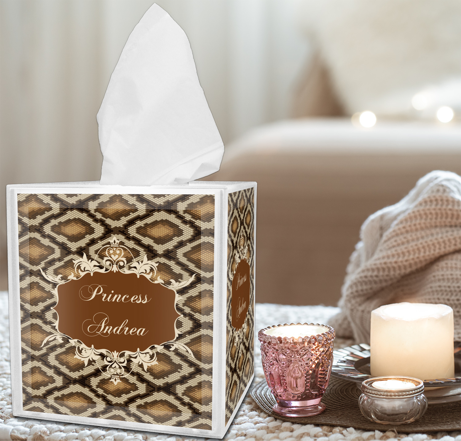 Snake skin print is currently trending and so we created this incredibly beautiful design with a snake skin background in classic browns and beige. The gorgeous label is one of the labels in our floral frames collection. It looks like a crown and thus we chose the personalization to include "princess".