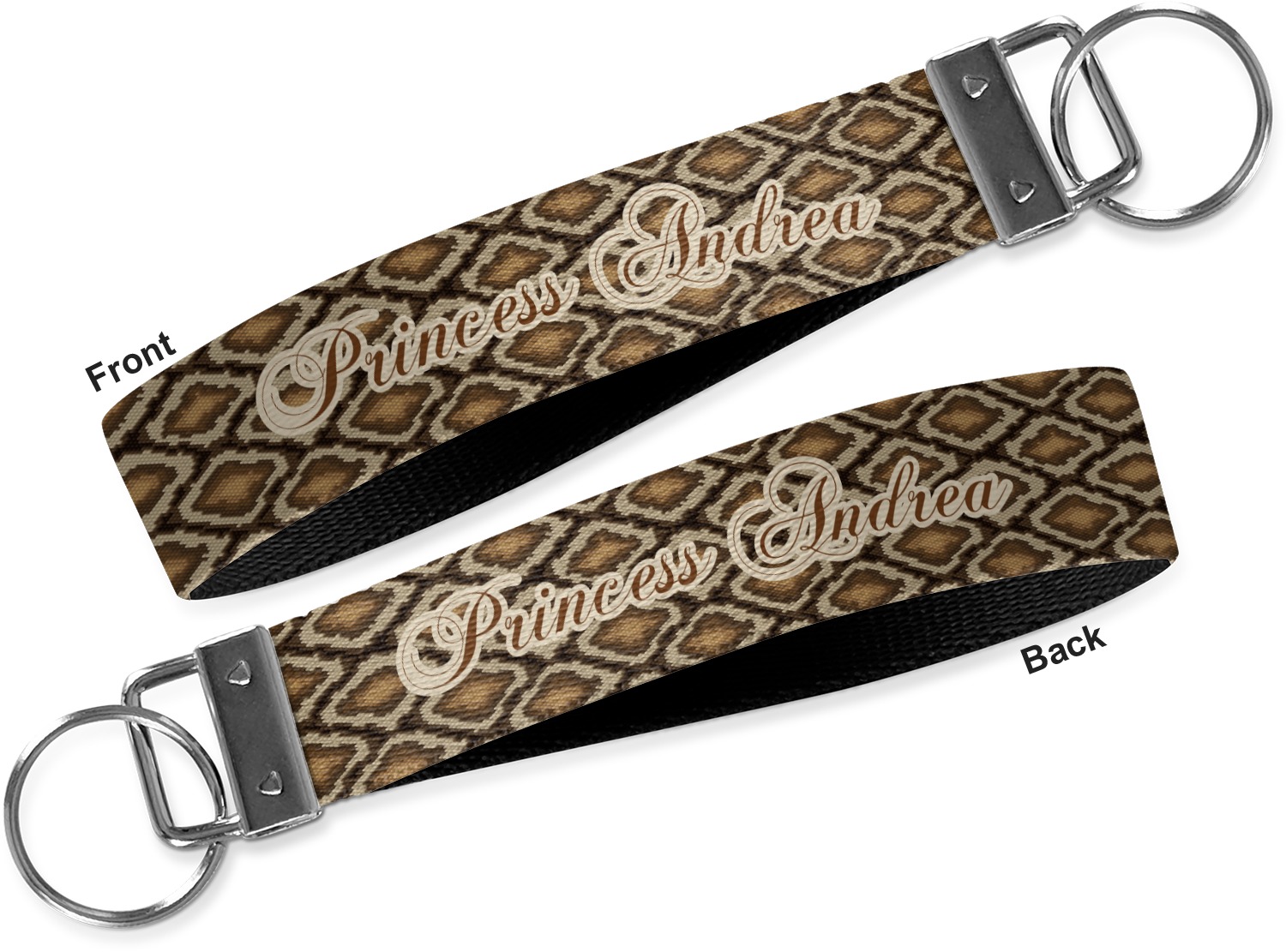 These key fob keychains are made from a polyester weave, right here in the USA. They feature a silver, metal clasp, attached to a round keyring. The piece gives the personalized wristlet a beautiful, finished look. Your customized design is printed on the outside of the keychain strap. We carry these wristlets in two sizes: small, which is 5 inches in width, and large, which is 5.5 inches in width.