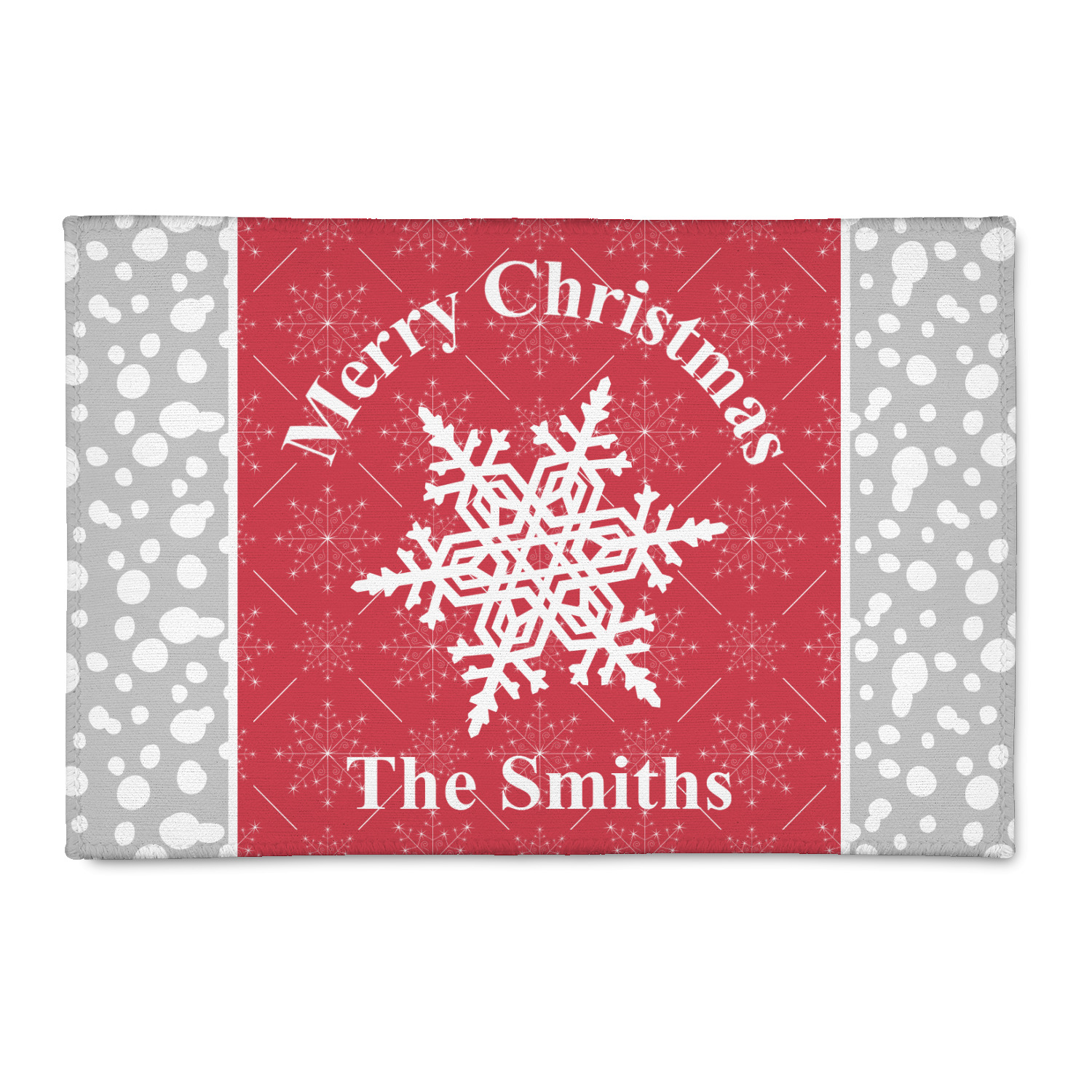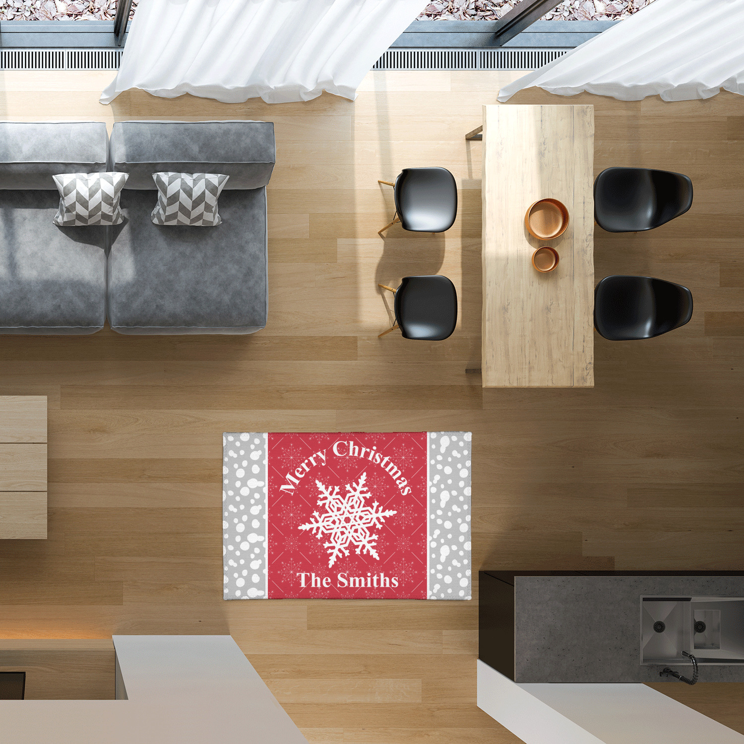 This design idea shows a calm grey and white snowflake filled background on either side of a red and white snowflake pattern in the middle. A big white snowflake have your greeting and personalization above and below it. This is a wonderful design idea to get your Christmas decorations started!