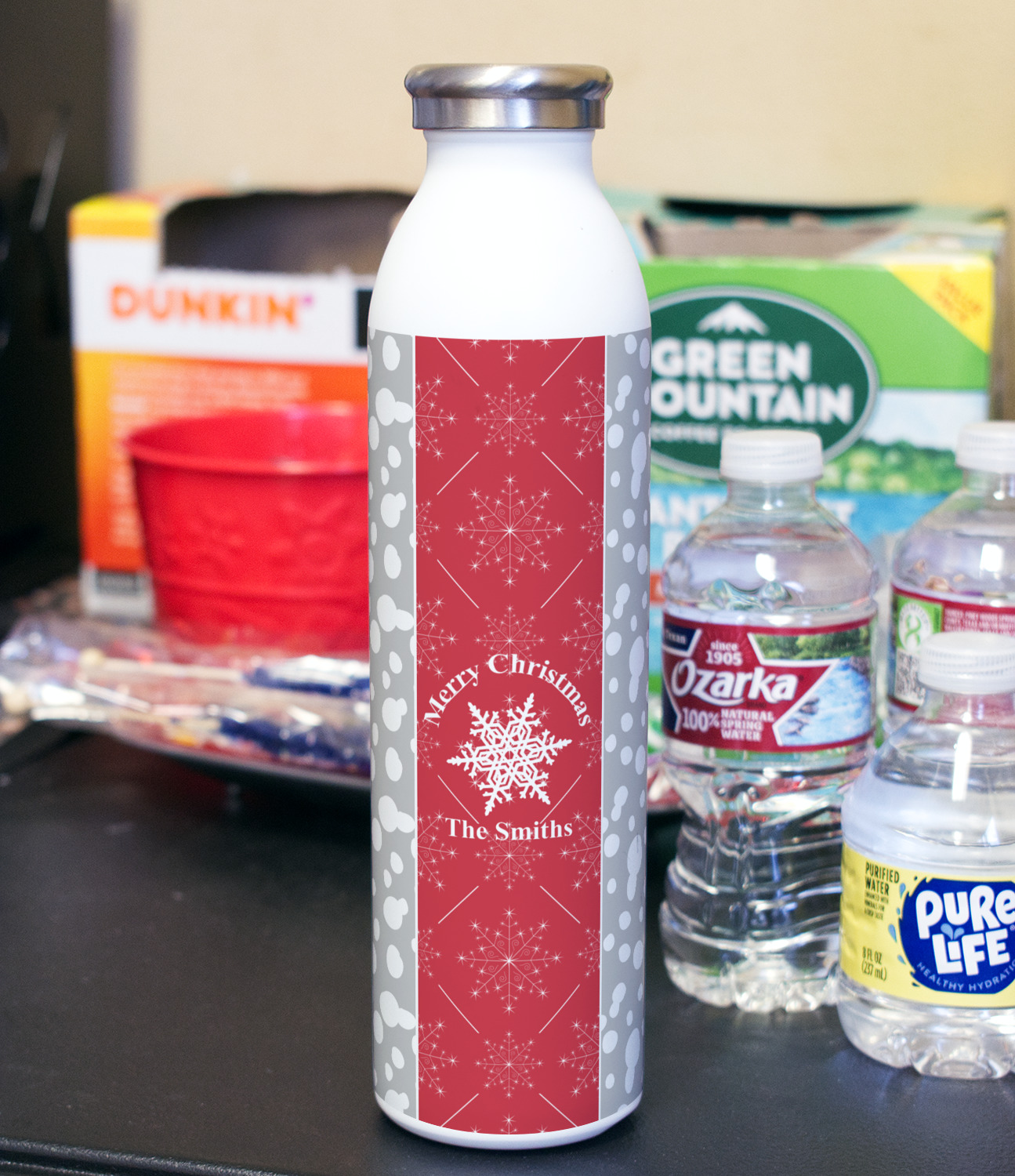 This design idea shows a calm grey and white snowflake filled background on either side of a red and white snowflake pattern in the middle. A big white snowflake have your greeting and personalization above and below it. This is a wonderful design idea to get your Christmas decorations started!