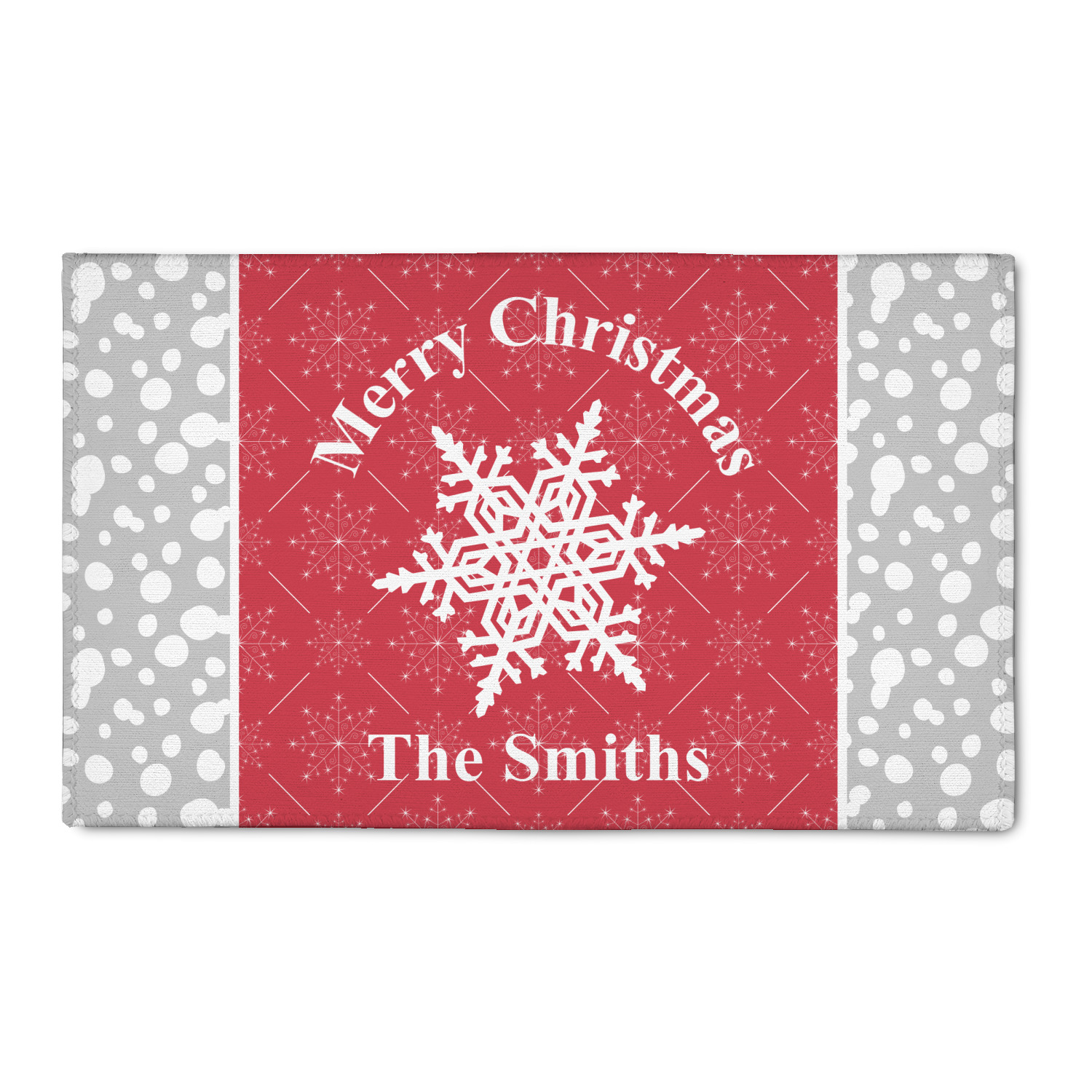 This design idea shows a calm grey and white snowflake filled background on either side of a red and white snowflake pattern in the middle. A big white snowflake have your greeting and personalization above and below it. This is a wonderful design idea to get your Christmas decorations started!