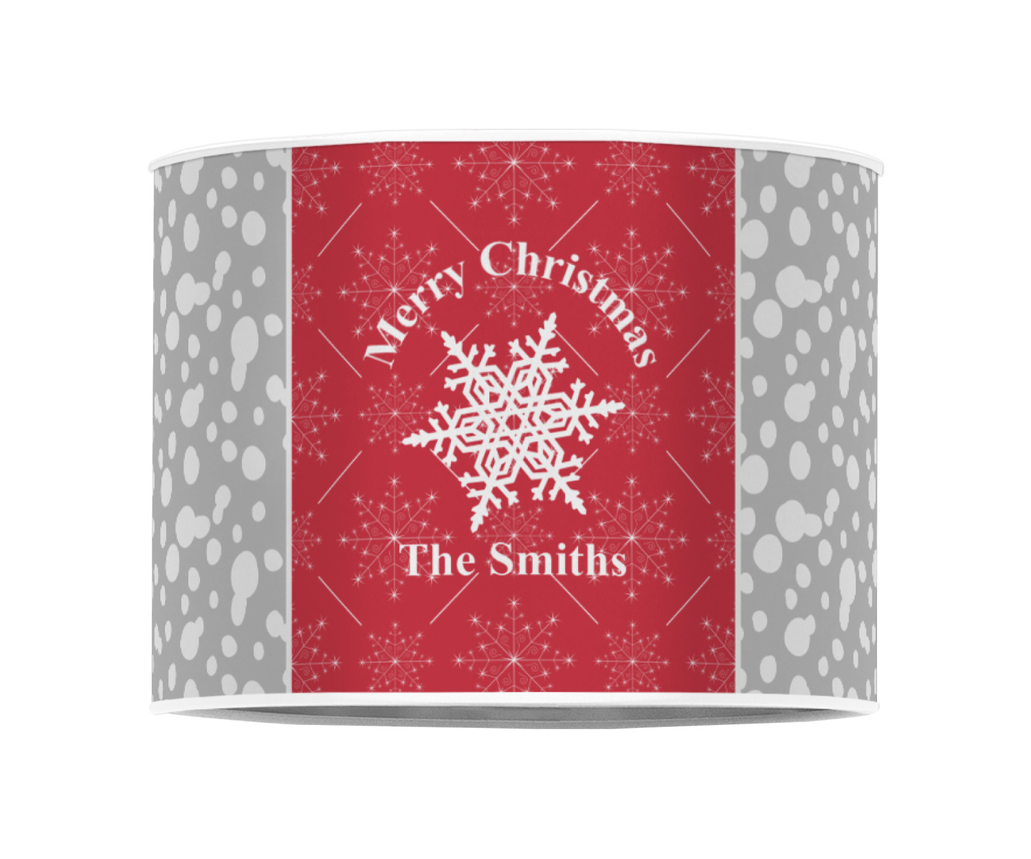 This design idea shows a calm grey and white snowflake filled background on either side of a red and white snowflake pattern in the middle. A big white snowflake have your greeting and personalization above and below it. This is a wonderful design idea to get your Christmas decorations started!