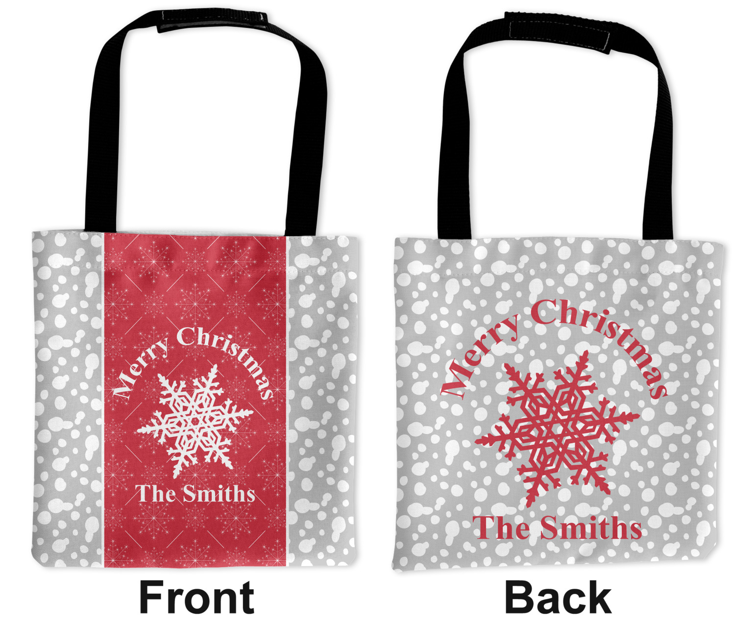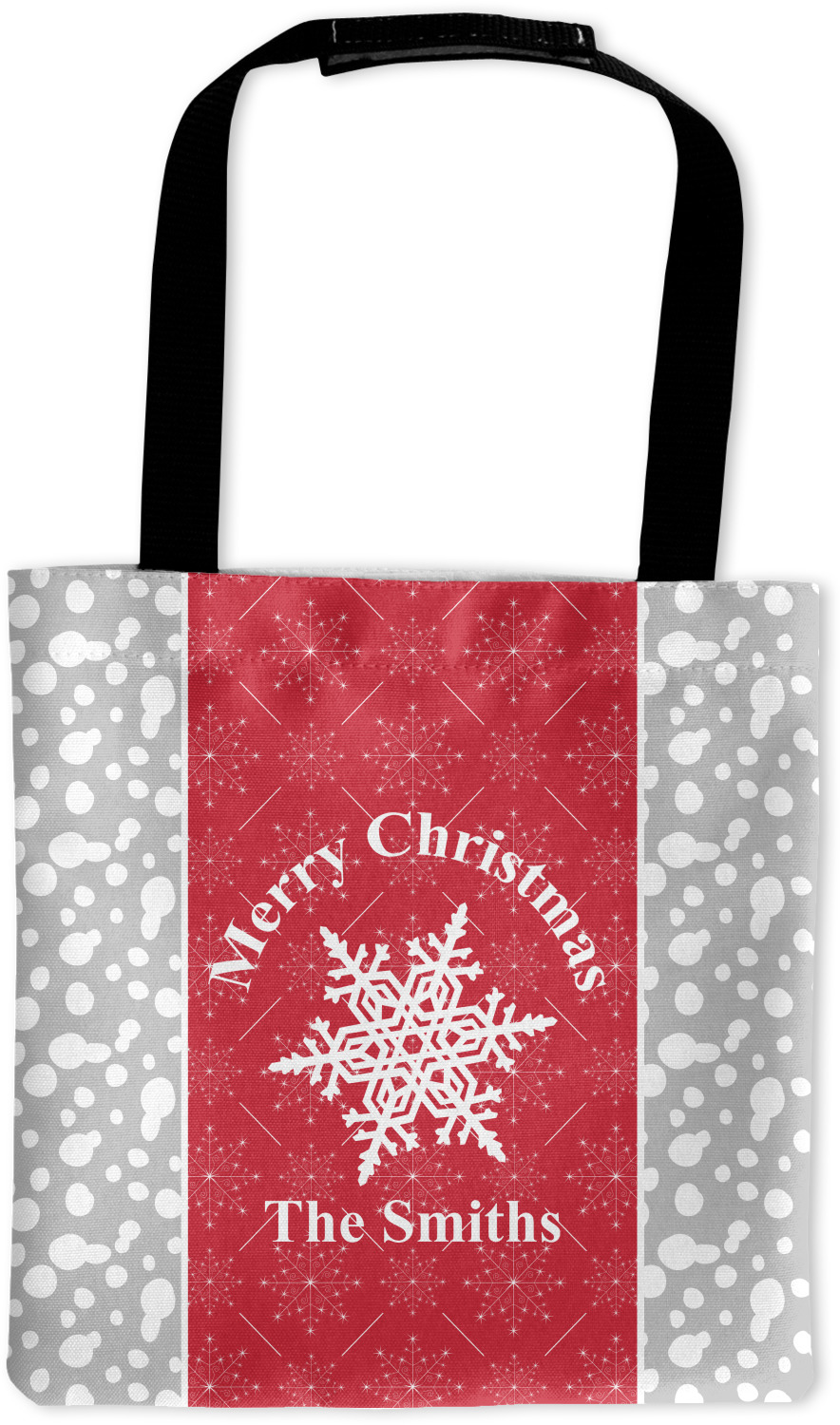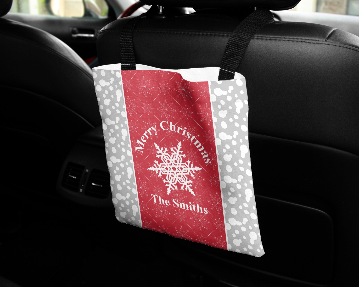 This design idea shows a calm grey and white snowflake filled background on either side of a red and white snowflake pattern in the middle. A big white snowflake have your greeting and personalization above and below it. This is a wonderful design idea to get your Christmas decorations started!