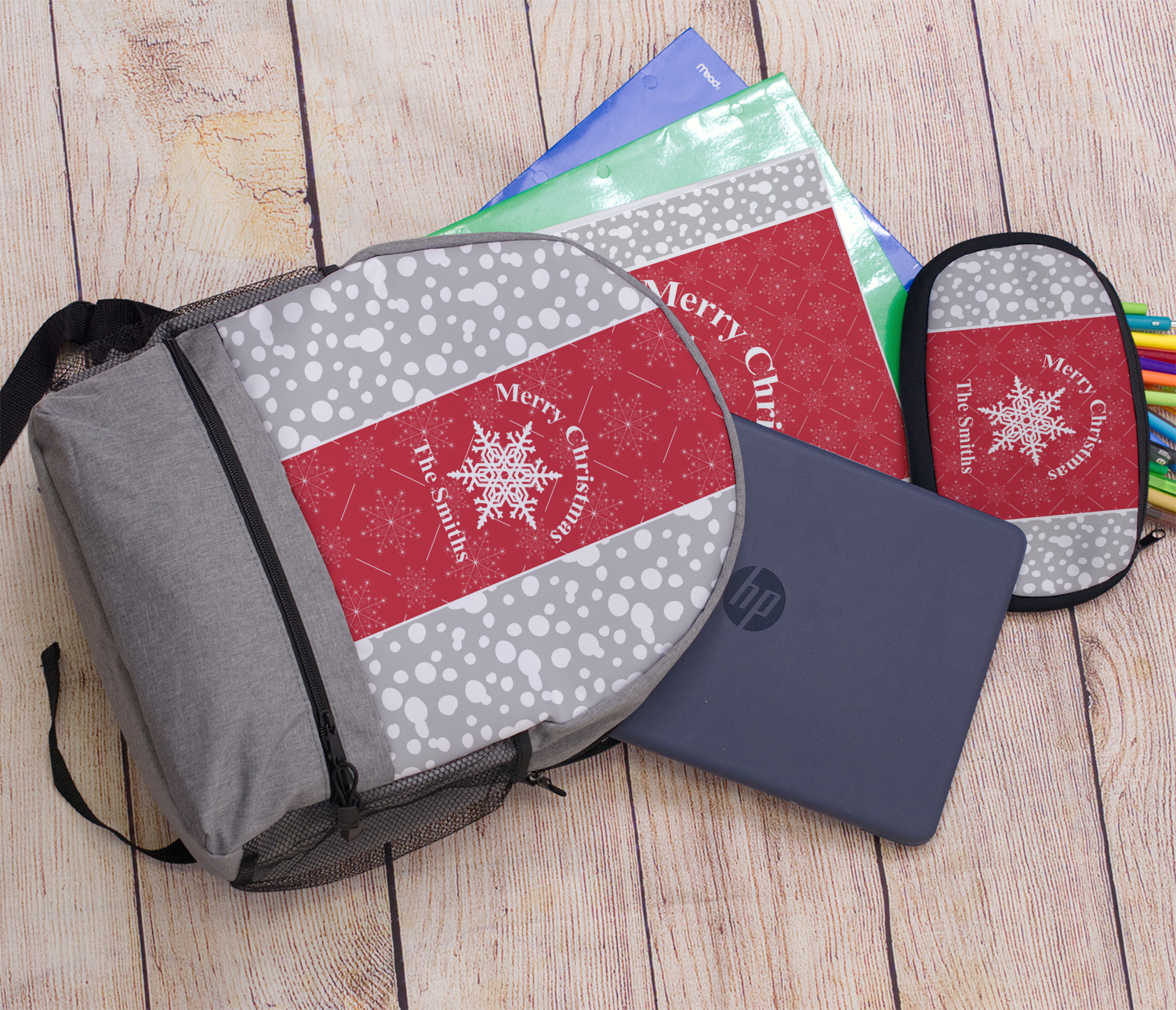 This design idea shows a calm grey and white snowflake filled background on either side of a red and white snowflake pattern in the middle. A big white snowflake have your greeting and personalization above and below it. This is a wonderful design idea to get your Christmas decorations started!