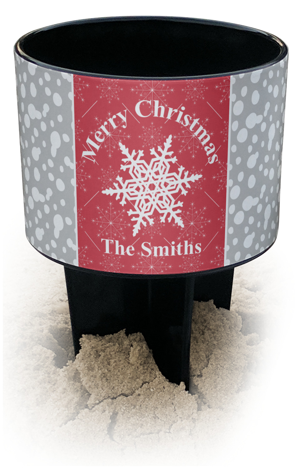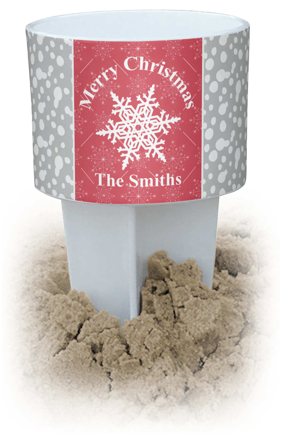 This cup holder has a large stake at its bottom that anchors it to the sand or ground below, while the cup holder rests above the stake. The entire drink holder is made of durable plastic and displays your customization around the cup holder portion. We sell these personalized beach spikers in two different colors: black and white.