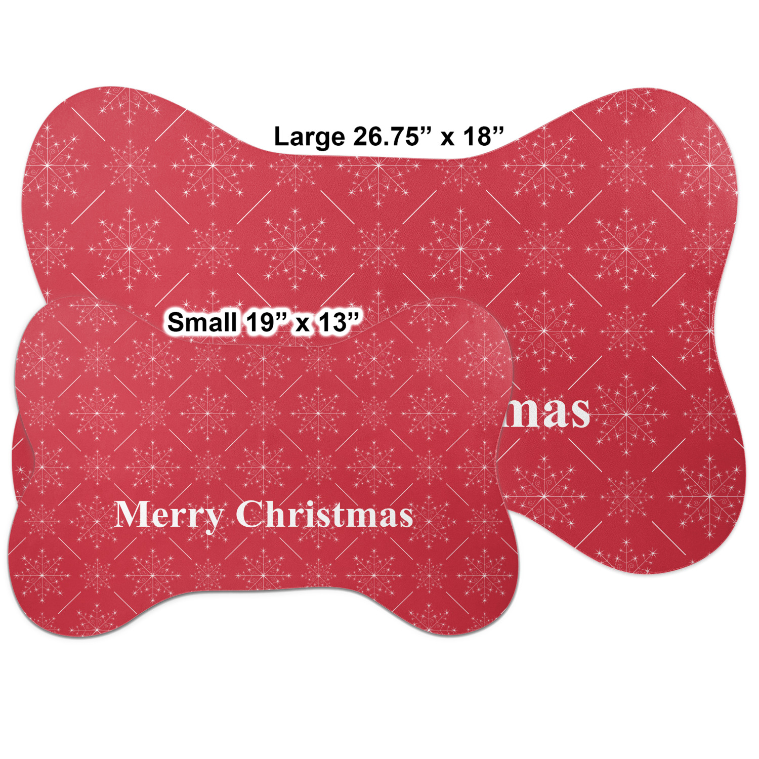 The top of this mat displays your custom design, as it is printed on polyester. To prevent slippage, the underside of the mat is made of rubber. We offer a small dog food mat, suitable for smaller dogs and a large dog food mat for bigger breeds. The small dog food mat is approximately 19 by 13 inches, while the large dog feeding mat measures at approximately 26.75 by 18 inches. Both personalized mats are ideally sized to fit two dog bowls.