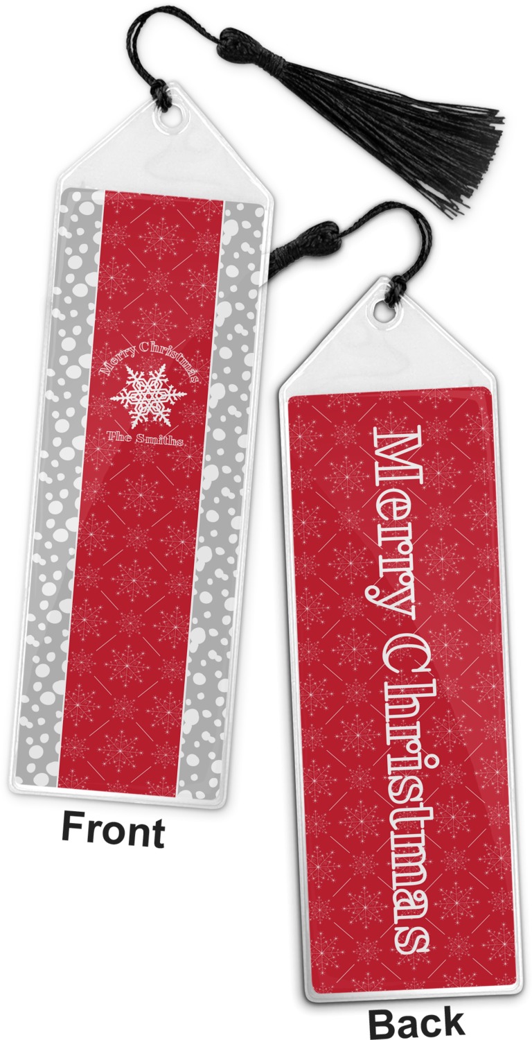 Your personalized bookmark is made of a sturdy, clear vinyl, and is approximately 7.5" x 2.25". We display your personalization on vinyl inserts that are placed on both sides. Accompanying each book marker is a black, fringe tassel that attaches to the reinforced, triangular header.