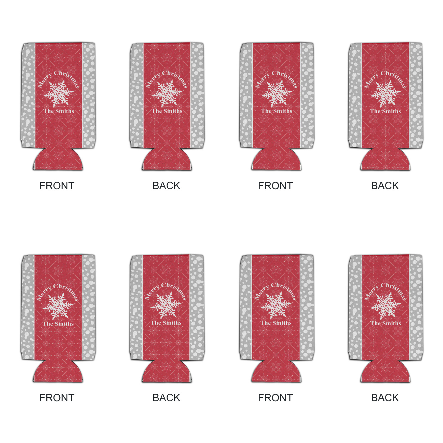 This design idea shows a calm grey and white snowflake filled background on either side of a red and white snowflake pattern in the middle. A big white snowflake have your greeting and personalization above and below it. This is a wonderful design idea to get your Christmas decorations started!