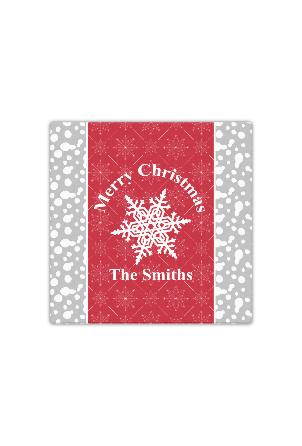 This design idea shows a calm grey and white snowflake filled background on either side of a red and white snowflake pattern in the middle. A big white snowflake have your greeting and personalization above and below it. This is a wonderful design idea to get your Christmas decorations started!
