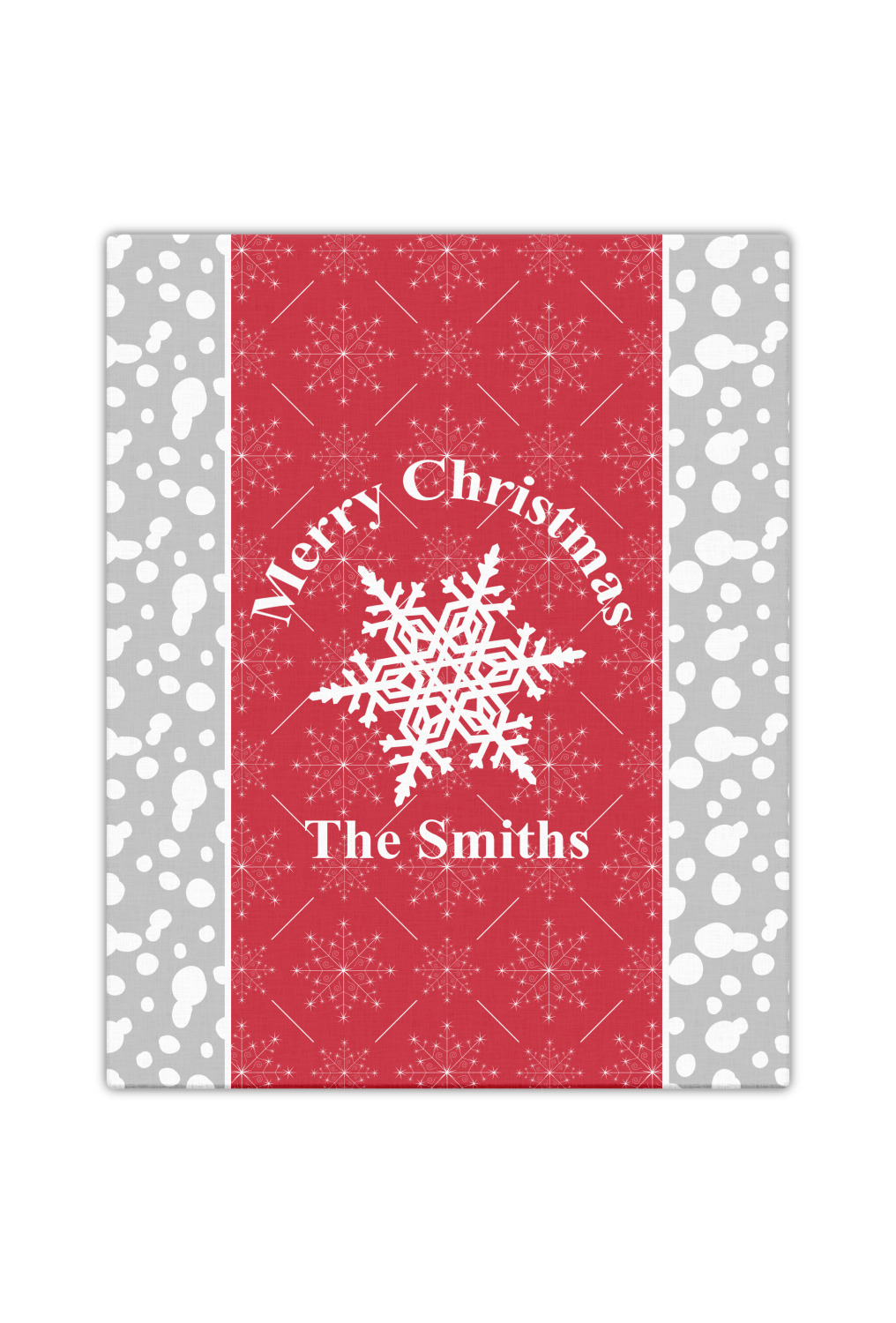 This design idea shows a calm grey and white snowflake filled background on either side of a red and white snowflake pattern in the middle. A big white snowflake have your greeting and personalization above and below it. This is a wonderful design idea to get your Christmas decorations started!