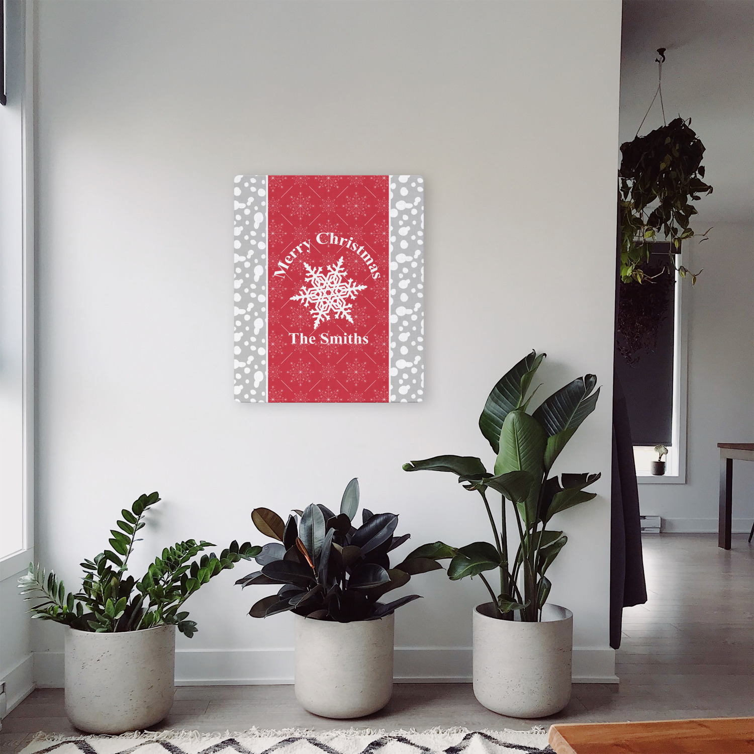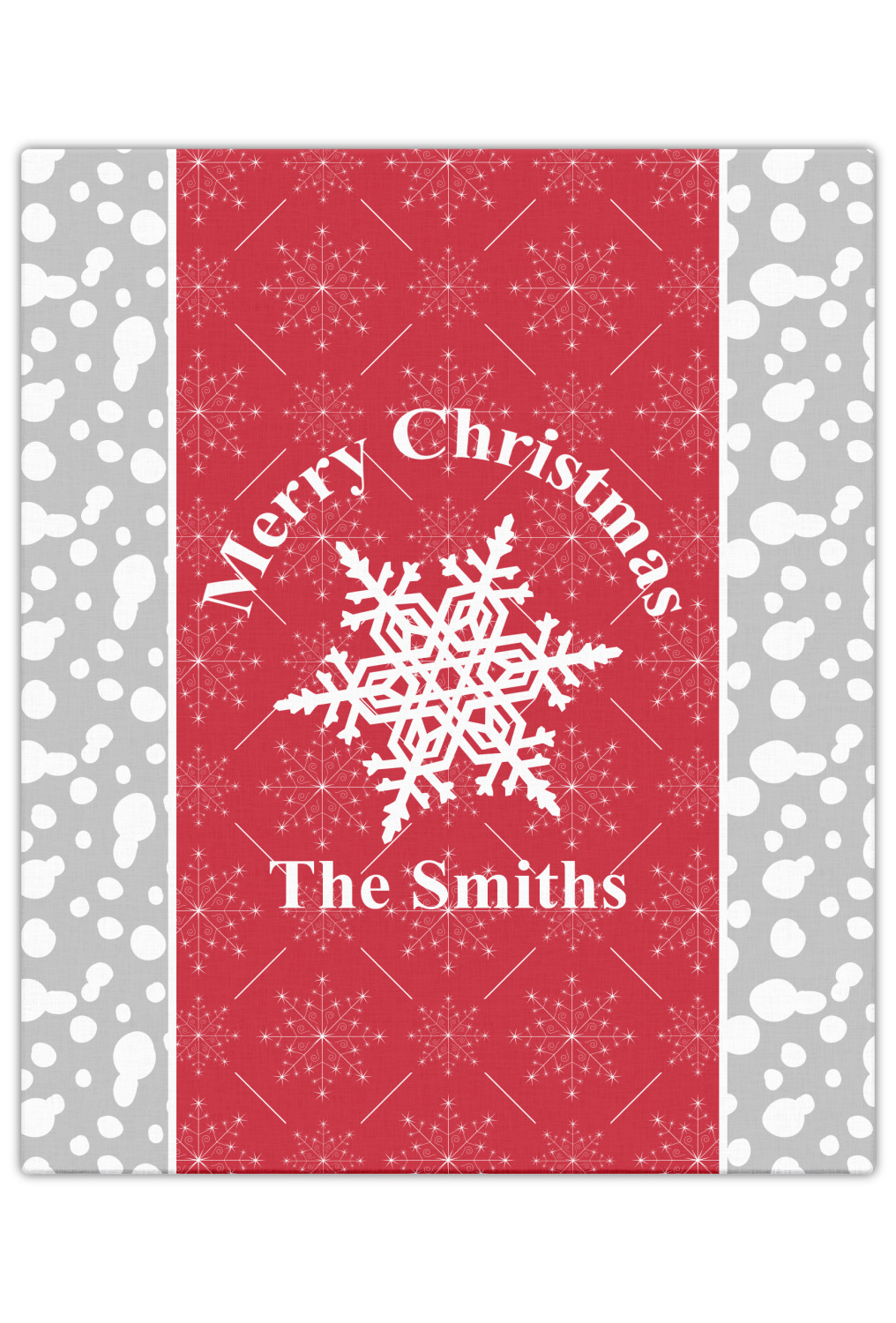 This design idea shows a calm grey and white snowflake filled background on either side of a red and white snowflake pattern in the middle. A big white snowflake have your greeting and personalization above and below it. This is a wonderful design idea to get your Christmas decorations started!