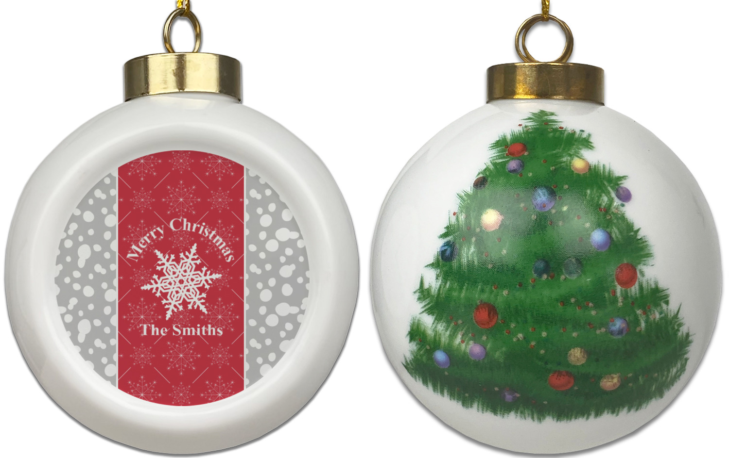 Our Christmas ornaments are a unique ceramic ball shape with a twist as it has a flat face to display your custom design! Select from one of our two design types - Christmas Tree or Poinsettia Garland - to adorn the curved back of your personal design. Each ornament measures 3H x 2.5W x 2D accompanied with a gold string accent for finishing touches to hang on your beautiful Christmas tree!