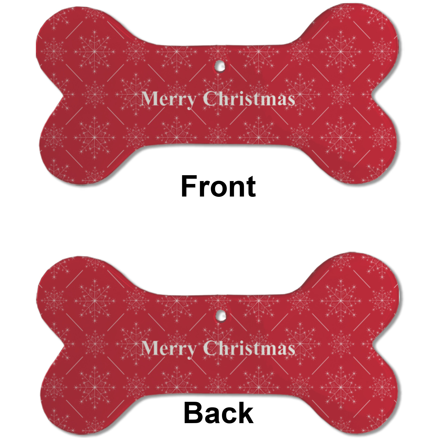 Our dog Christmas ornaments are a ceramic material with a bone-shaped structure hung horizontally. We offer two printing styles to personalize your furry friend's ornament! Choose a one-sided printing, perfect for wall decor, memorial accessory, or doghouse nameplate! Create a double-sided ornament perfect for adorning the Christmas tree. Each dog bone ornament is approximately 4.75" x 2.25" and is printed here in the USA.